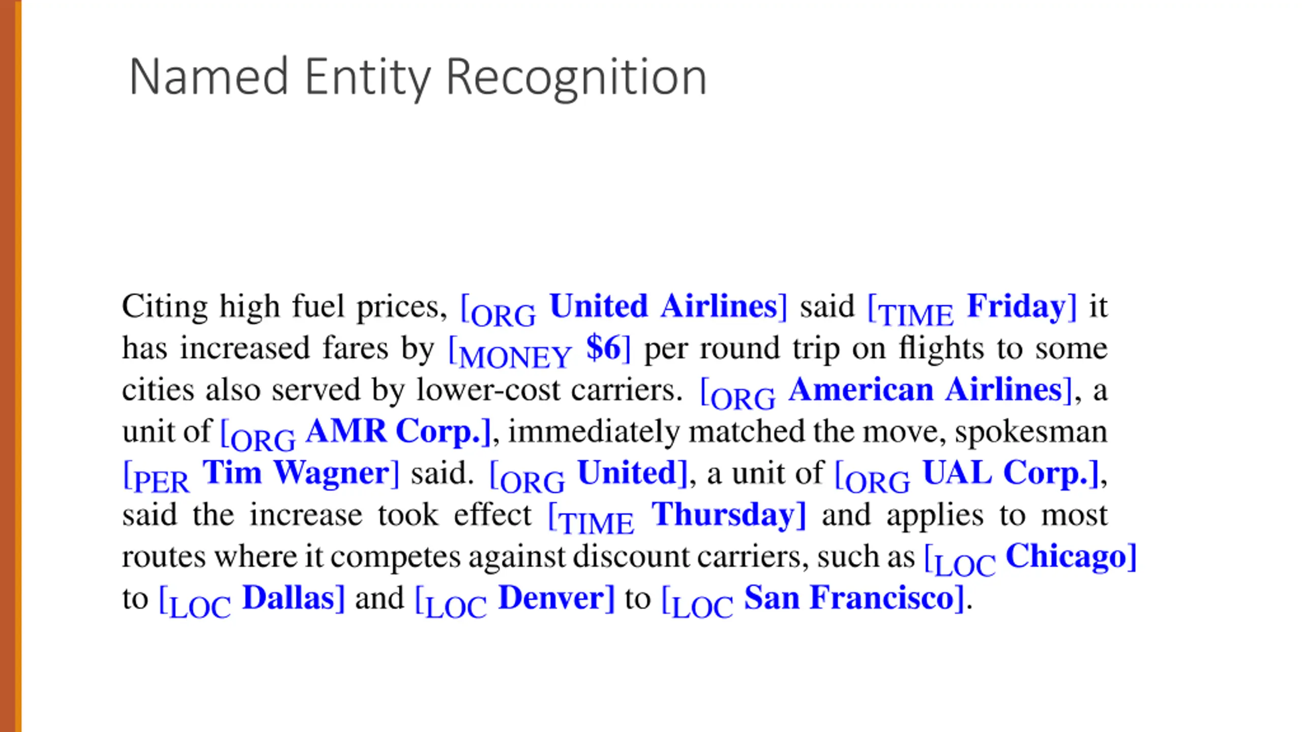 Named Entity Recognition A named entity is anything that can be referred to with a proper name: a person, a location, an organization Named entity recognition (NER): find spans of text that constitute proper names and tag the type of the entity