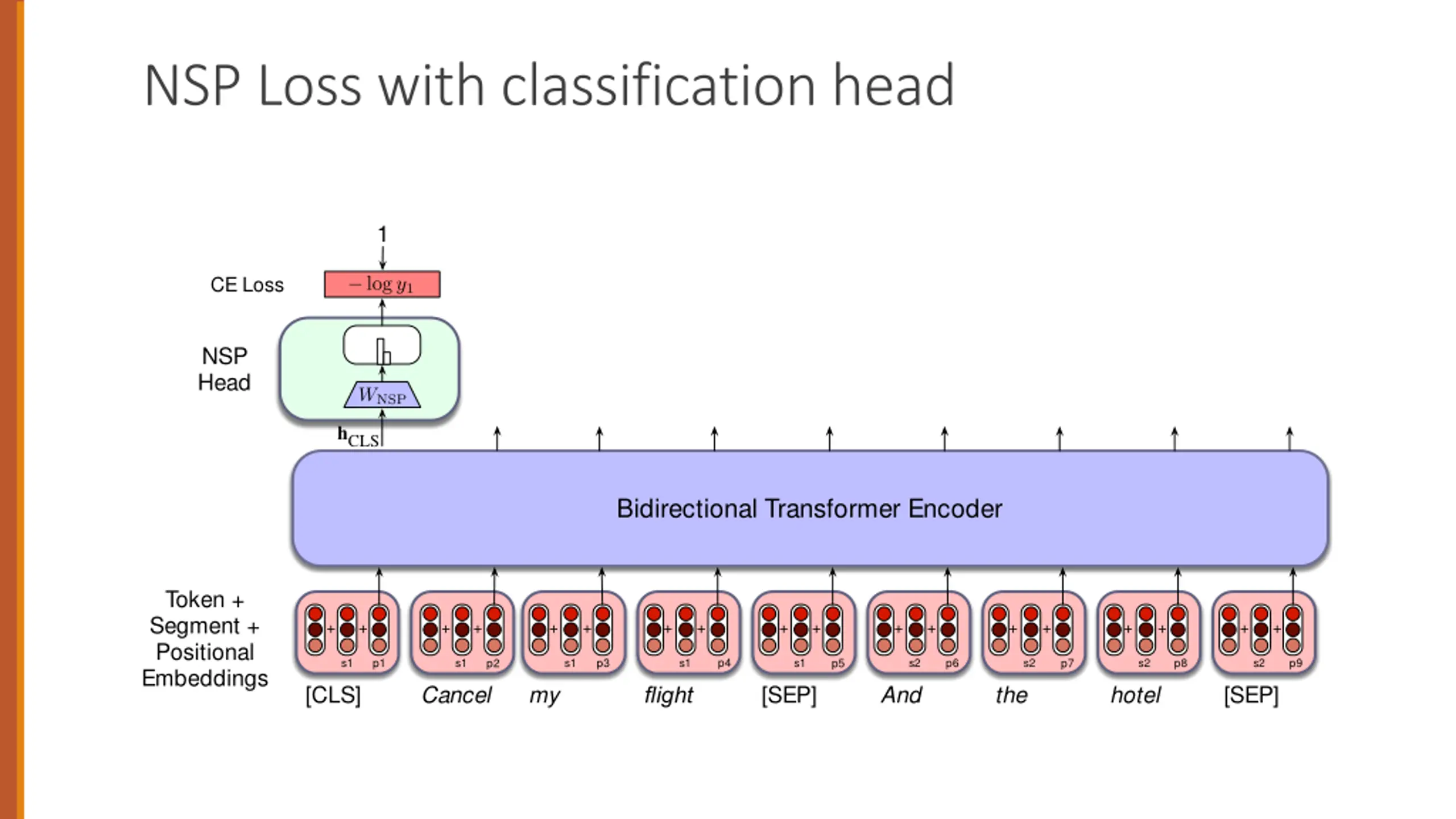 NSP Loss with classification head 1 CE Loss NSP Head hCLS Bidirectional Transformer Encoder Token + Segment + Positional Embeddings + + + + + + + + + + + + + + + + + + p4 p6 s1 p1 s1 s1 p3 s1 s1 s2 s2 s2 p8 s2 p9 p5 p7 p2 [CLS] Cancel my [SEP] And the hotel [SEP] flight