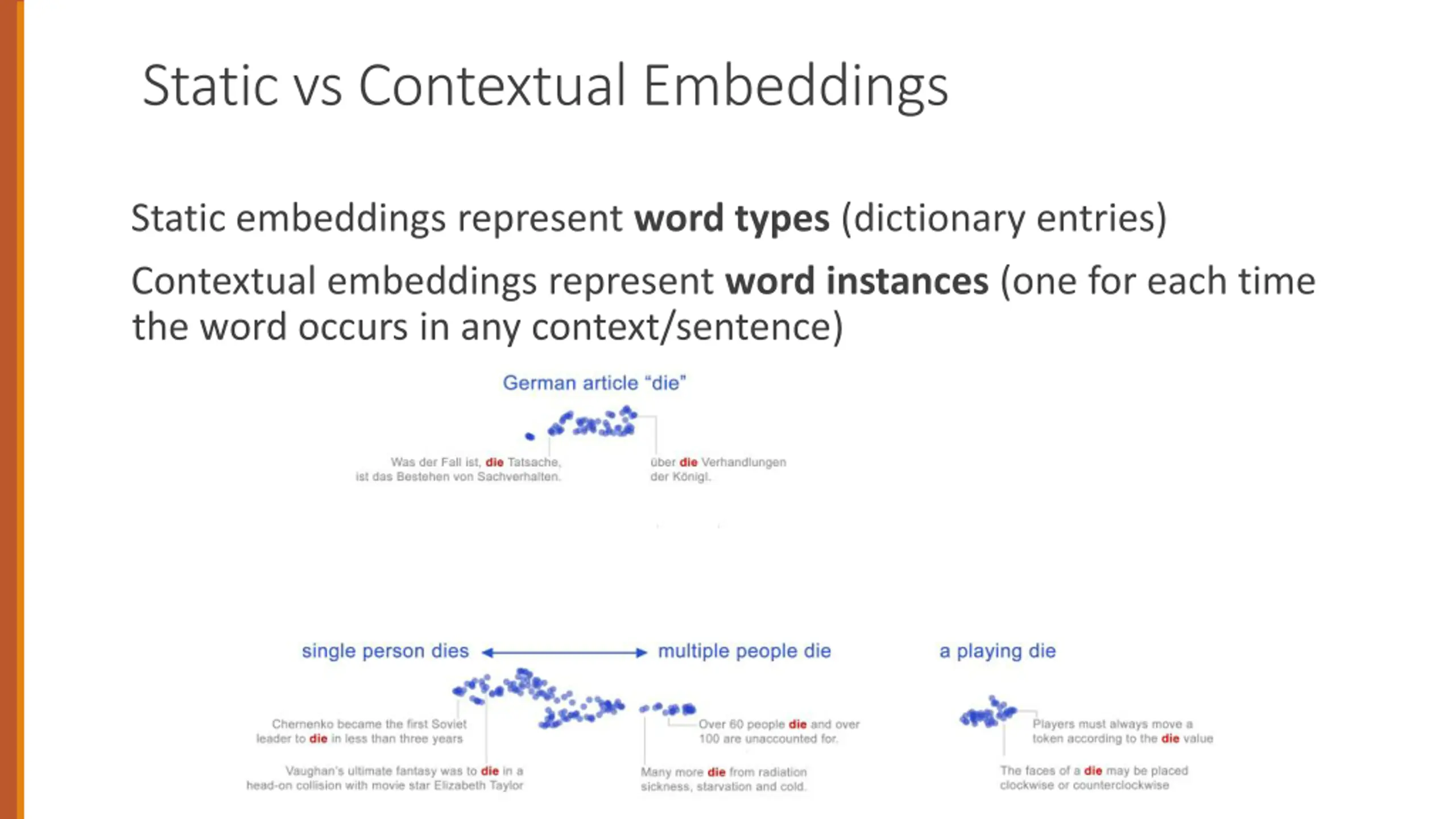 Static vs Contextual Embeddings Static embeddings represent word types (dictionary entries) Contextual embeddings represent word instances (one for each time the word occurs in any context/sentence)