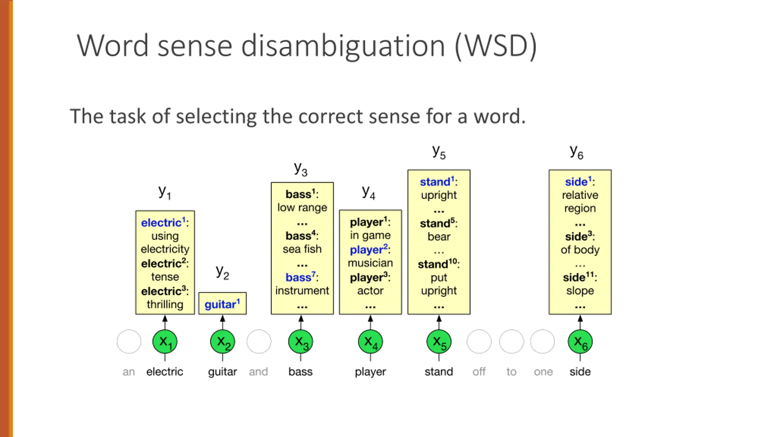 Word sense disambiguation (WSD) The task of selecting the correct sense for a word.