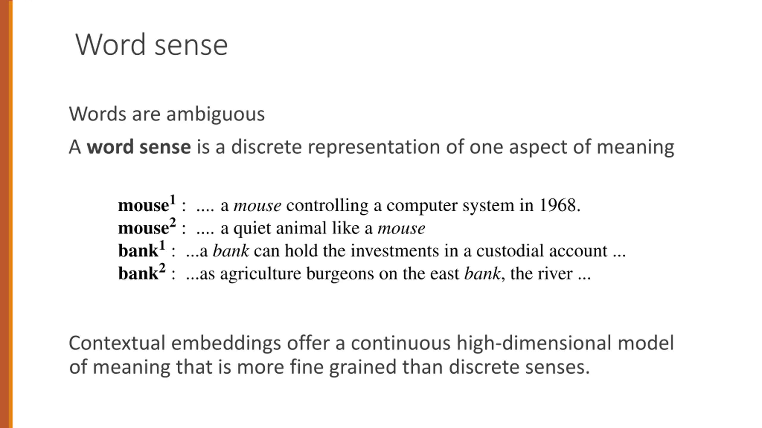 Word sense Words are ambiguous A word sense is a discrete representation of one aspect of meaning Contextual embeddings offer a continuous high-dimensional model of meaning that is more fine grained than discrete senses.