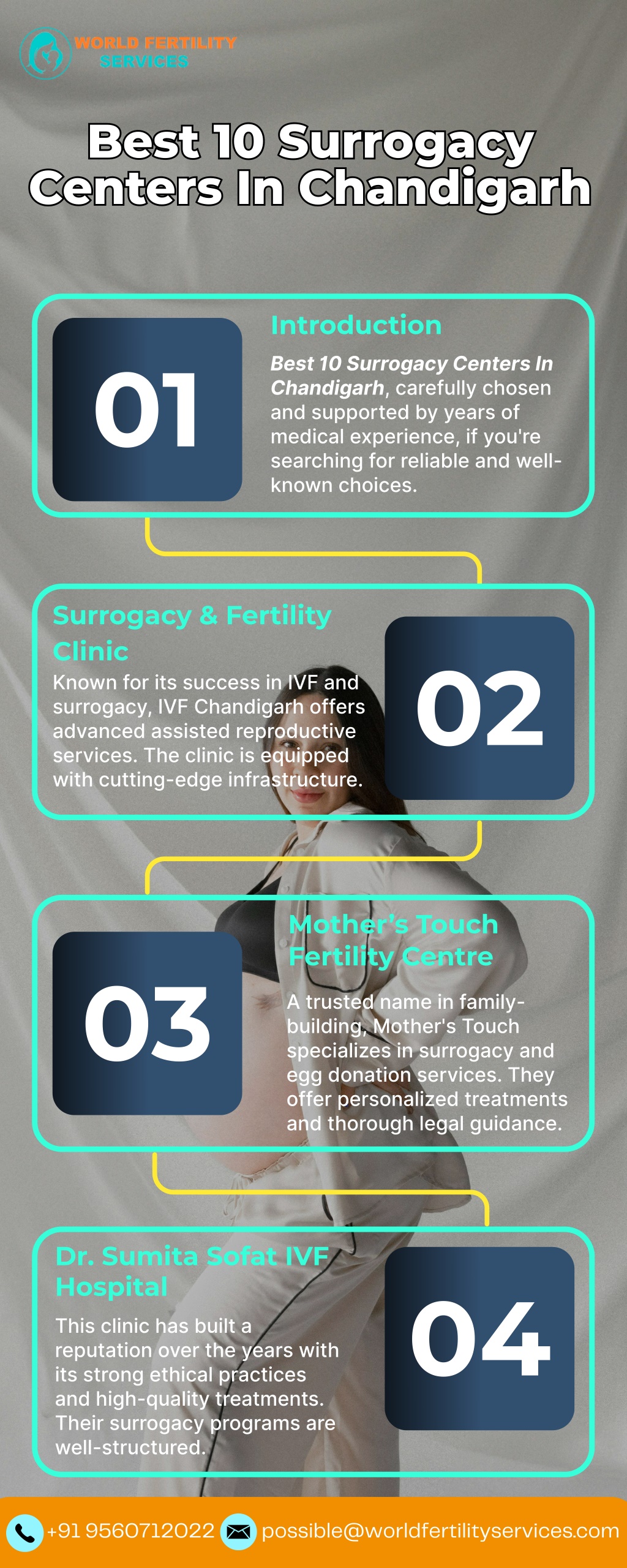 Best10Surrogacy CentersInChandigarh Centers In Chandigarh Best 10 Surrogacy Introduction 01 Best 10 Surrogacy Centers In Chandigarh, carefully chosen and supported by years of medical experience, if you're searching for reliable and well- known choices. Surrogacy & Fertility Clinic Known for its success in IVF and surrogacy, IVF Chandigarh offers advanced assisted reproductive services. The clinic is equipped with cutting-edge infrastructure. 02 Mother s Touch Fertility Centre 03 A trusted name in family- building, Mother's Touch specializes in surrogacy and egg donation services. They offer personalized treatments and thorough legal guidance. Dr. Sumita Sofat IVF Hospital 04 This clinic has built a reputation over the years with its strong ethical practices and high-quality treatments. Their surrogacy programs are well-structured. +91 9560712022 possible@worldfertilityservices.com