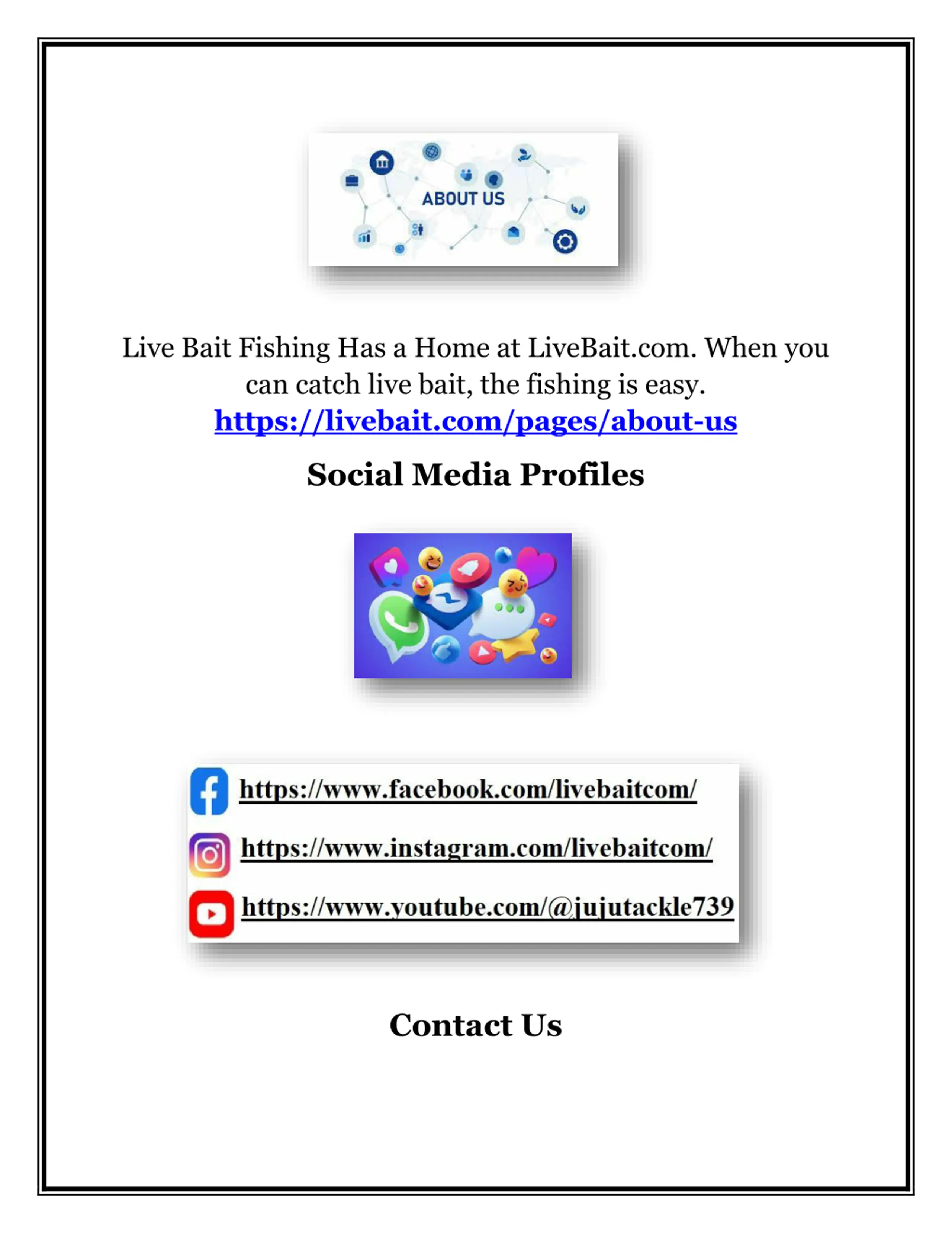 Live Bait Fishing Has a Home at LiveBait.com. When you can catch live bait, the fishing is easy. https://livebait.com/pages/about-us Social Media Profiles Contact Us
