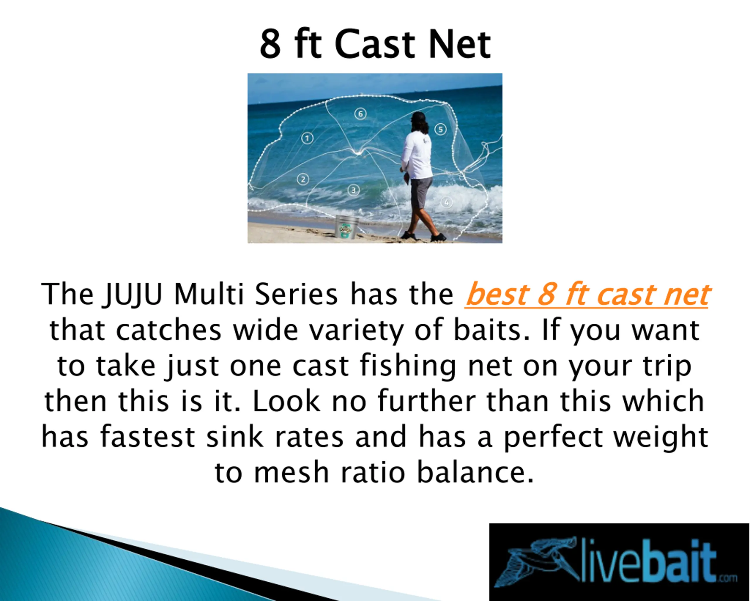 8 8 ft ft Cast Net Cast Net The JUJU Multi Series has the best 8 that catches wide variety of baits. If you want to take just one cast fishing net on your trip then this is it. Look no further than this which has fastest sink rates and has a perfect weight to mesh ratio balance. best 8 ft ft cast net cast net