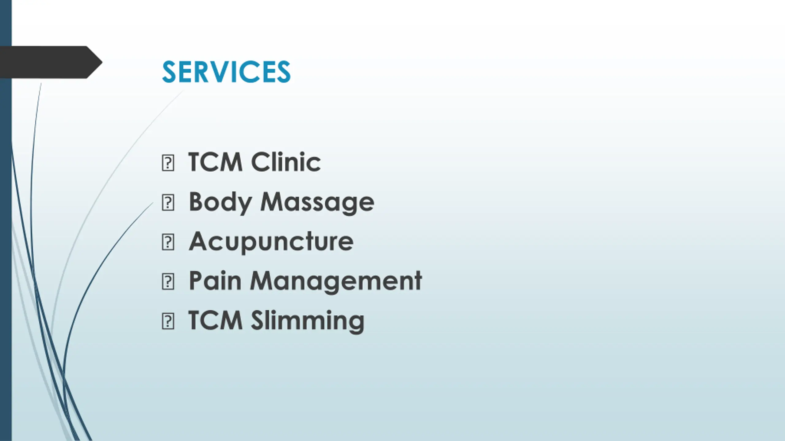 SERVICES ? TCM Clinic ? Body Massage ? Acupuncture ? Pain Management ? TCM Slimming
