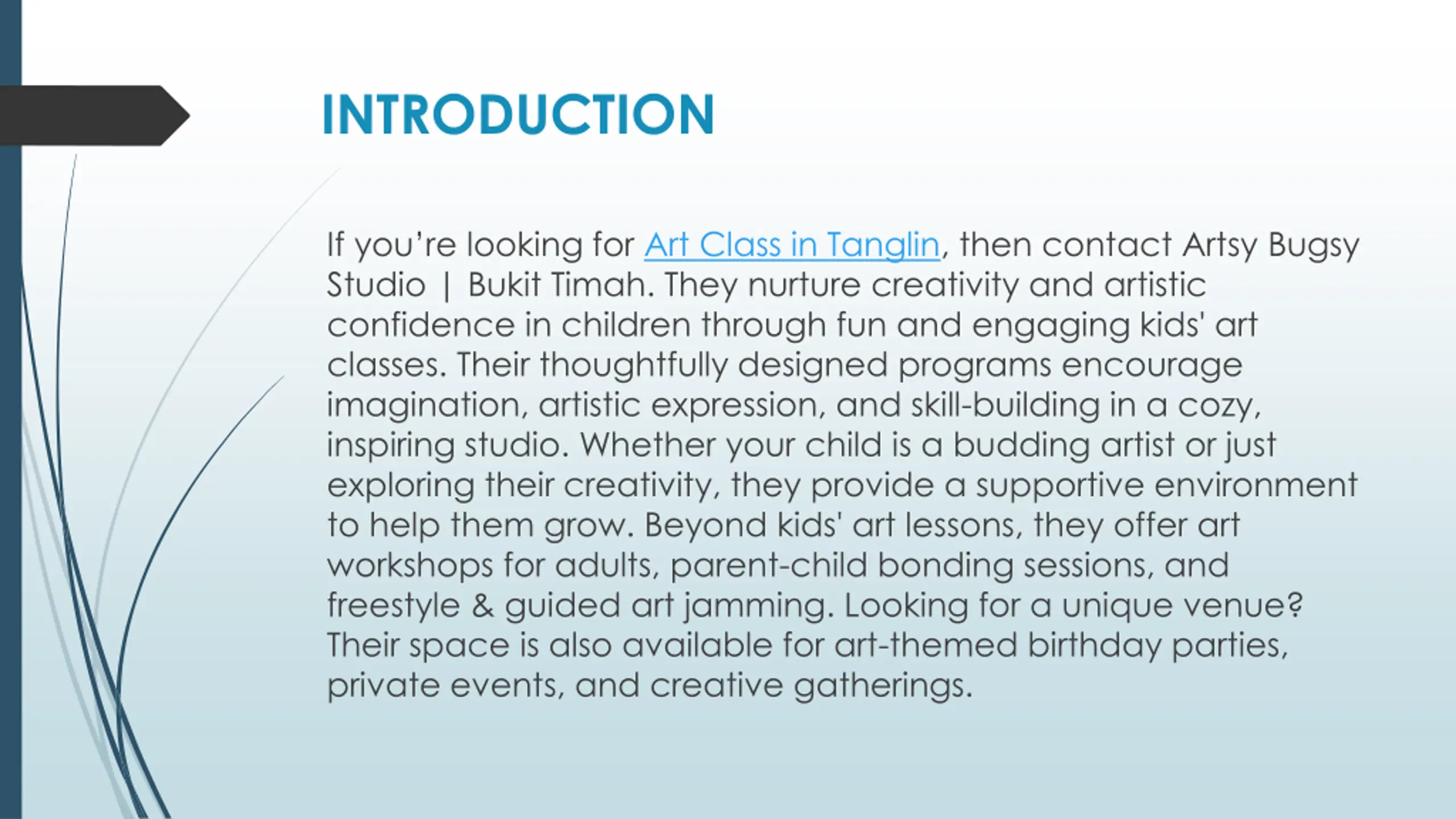 INTRODUCTION If you re looking for Art Class in Tanglin, then contact Artsy Bugsy Studio | Bukit Timah. They nurture creativity and artistic confidence in children through fun and engaging kids' art classes. Their thoughtfully designed programs encourage imagination, artistic expression, and skill-building in a cozy, inspiring studio. Whether your child is a budding artist or just exploring their creativity, they provide a supportive environment to help them grow. Beyond kids' art lessons, they offer art workshops for adults, parent-child bonding sessions, and freestyle & guided art jamming. Looking for a unique venue? Their space is also available for art-themed birthday parties, private events, and creative gatherings.