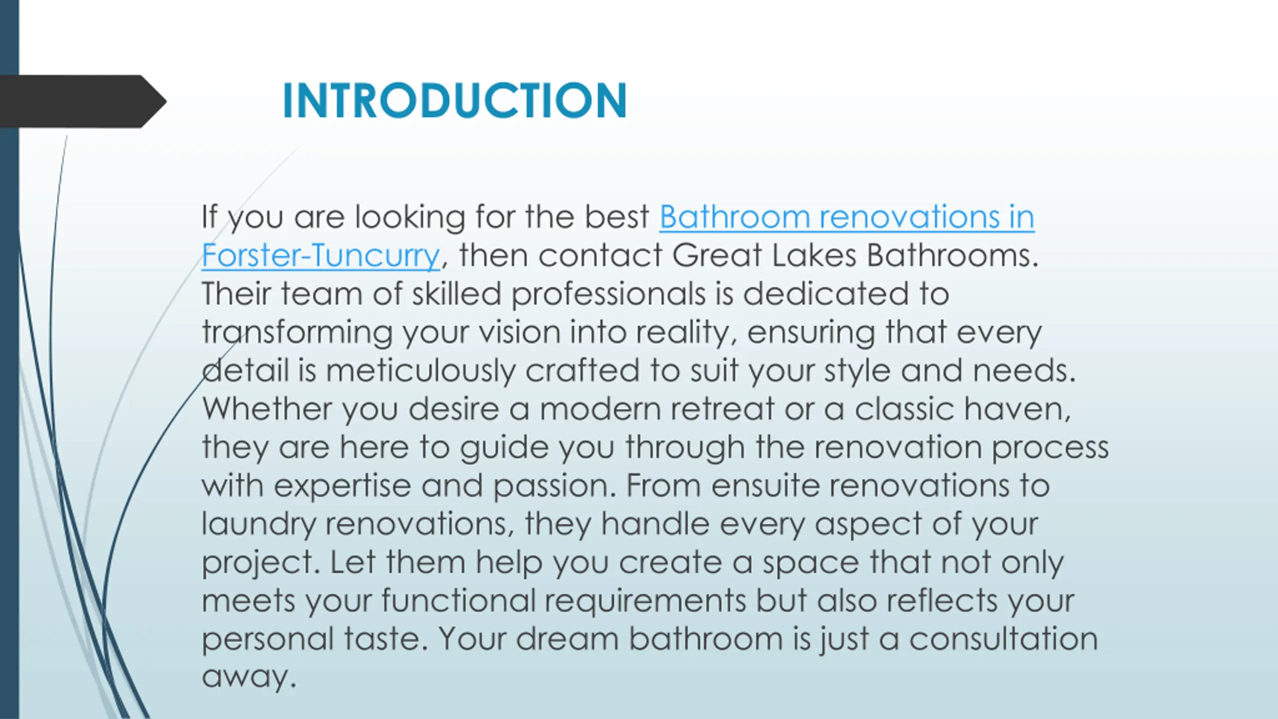 INTRODUCTION If you are looking for the best Bathroom renovations in Forster-Tuncurry, then contact Great Lakes Bathrooms. Their team of skilled professionals is dedicated to transforming your vision into reality, ensuring that every detail is meticulously crafted to suit your style and needs. Whether you desire a modern retreat or a classic haven, they are here to guide you through the renovation process with expertise and passion. From ensuite renovations to laundry renovations, they handle every aspect of your project. Let them help you create a space that not only meets your functional requirements but also reflects your personal taste. Your dream bathroom is just a consultation away.