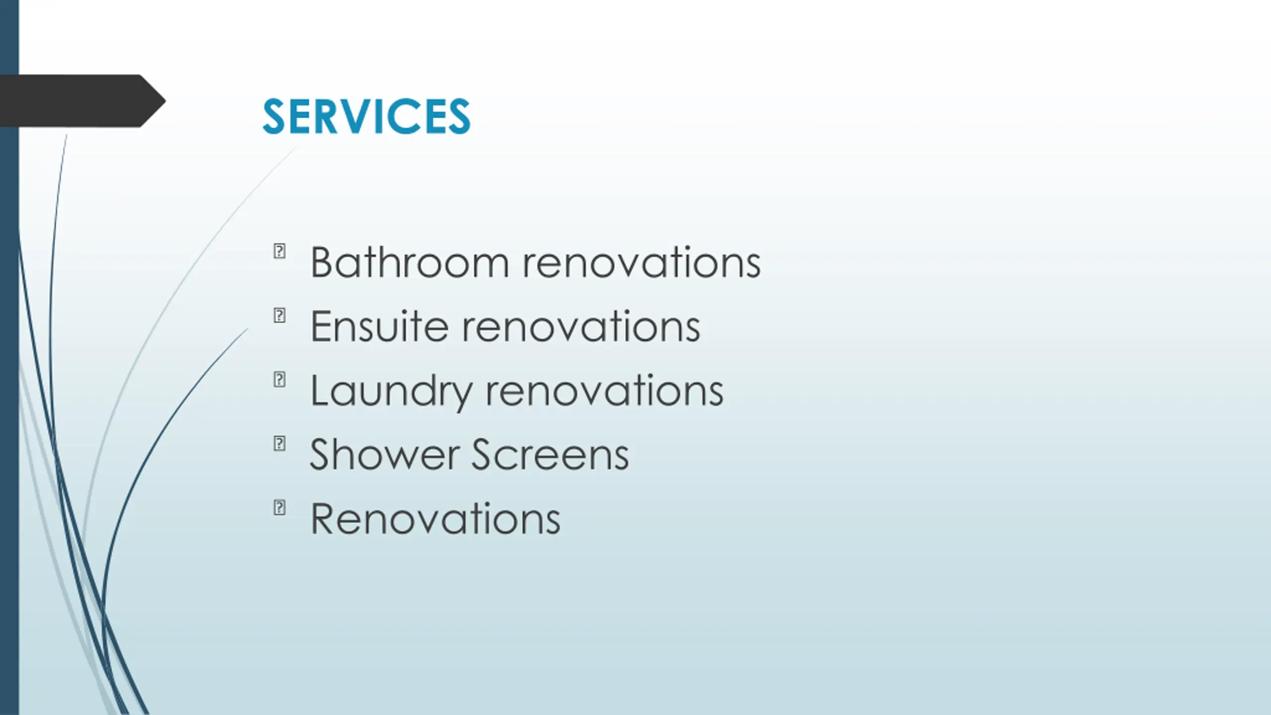 SERVICES ?Bathroom renovations ?Ensuite renovations ?Laundry renovations ?Shower Screens ?Renovations