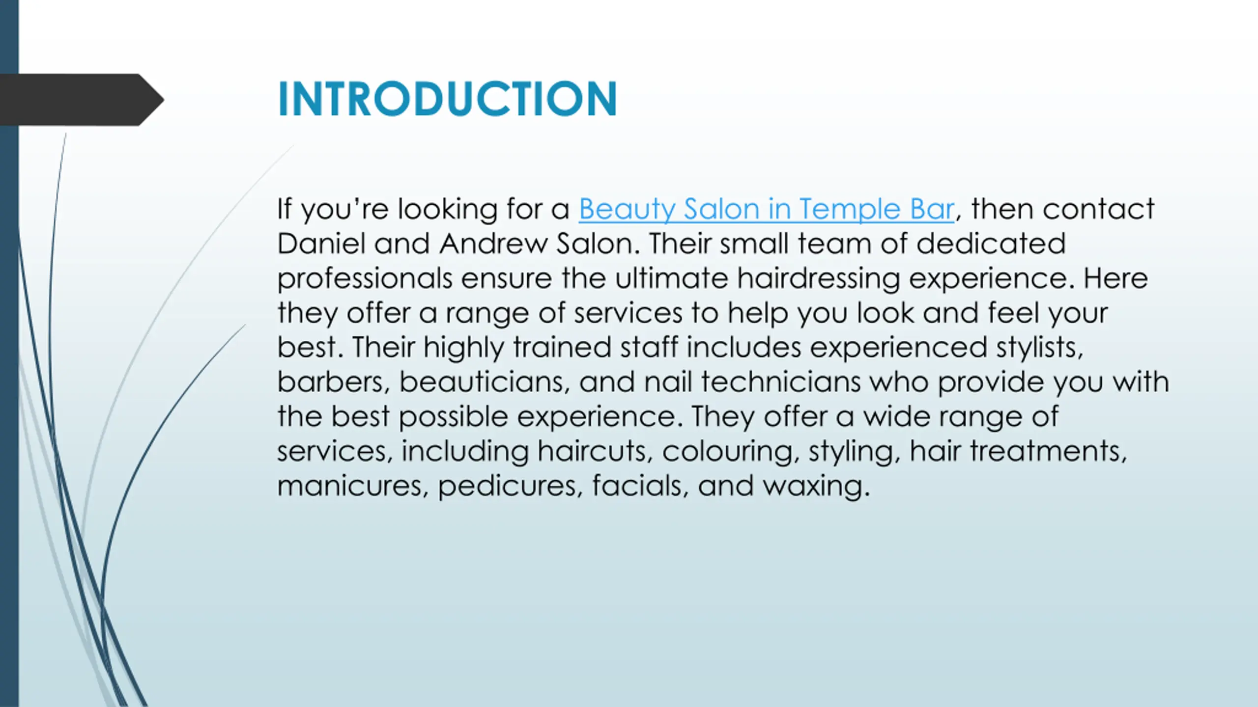 INTRODUCTION If you re looking for a Beauty Salon in Temple Bar, then contact Daniel and Andrew Salon. Their small team of dedicated professionals ensure the ultimate hairdressing experience. Here they offer a range of services to help you look and feel your best. Their highly trained staff includes experienced stylists, barbers, beauticians, and nail technicians who provide you with the best possible experience. They offer a wide range of services, including haircuts, colouring, styling, hair treatments, manicures, pedicures, facials, and waxing.