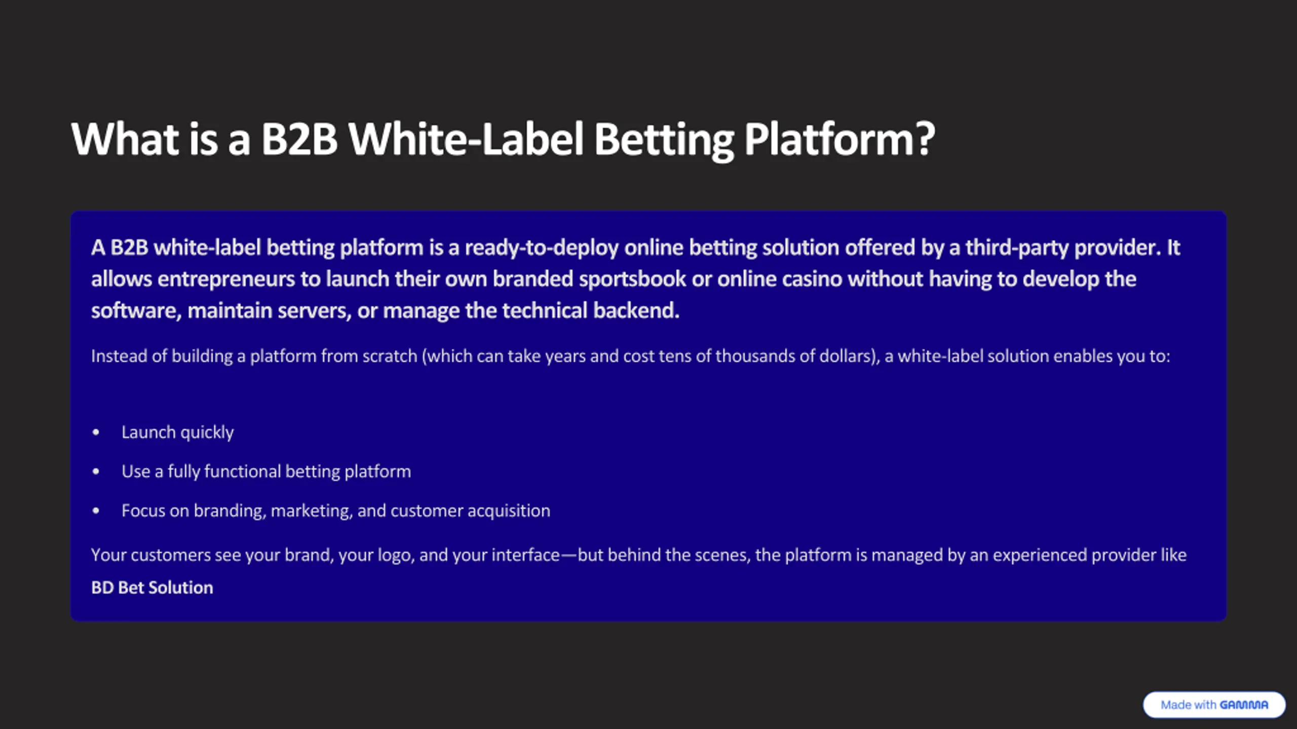 What is a B2B White-Label Betting Platform? A B2B white-label betting platform is a ready-to-deploy online betting solution offered by a third-party provider. It allows entrepreneurs to launch their own branded sportsbook or online casino without having to develop the software, maintain servers, or manage the technical backend. Instead of building a platform from scratch (which can take years and cost tens of thousands of dollars), a white-label solution enables you to: Launch quickly Use a fully functional betting platform Focus on branding, marketing, and customer acquisition Your customers see your brand, your logo, and your interface but behind the scenes, the platform is managed by an experienced provider like BD Bet Solution preencoded.png