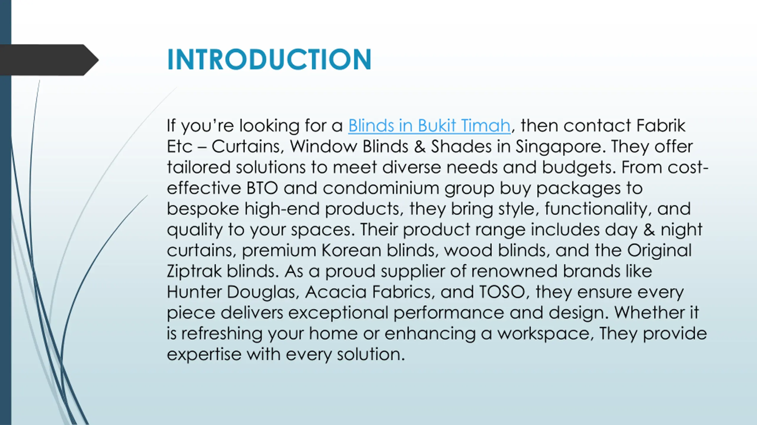INTRODUCTION If you re looking for a Blinds in Bukit Timah, then contact Fabrik Etc Curtains, Window Blinds & Shades in Singapore. They offer tailored solutions to meet diverse needs and budgets. From cost- effective BTO and condominium group buy packages to bespoke high-end products, they bring style, functionality, and quality to your spaces. Their product range includes day & night curtains, premium Korean blinds, wood blinds, and the Original Ziptrak blinds. As a proud supplier of renowned brands like Hunter Douglas, Acacia Fabrics, and TOSO, they ensure every piece delivers exceptional performance and design. Whether it is refreshing your home or enhancing a workspace, They provide expertise with every solution.