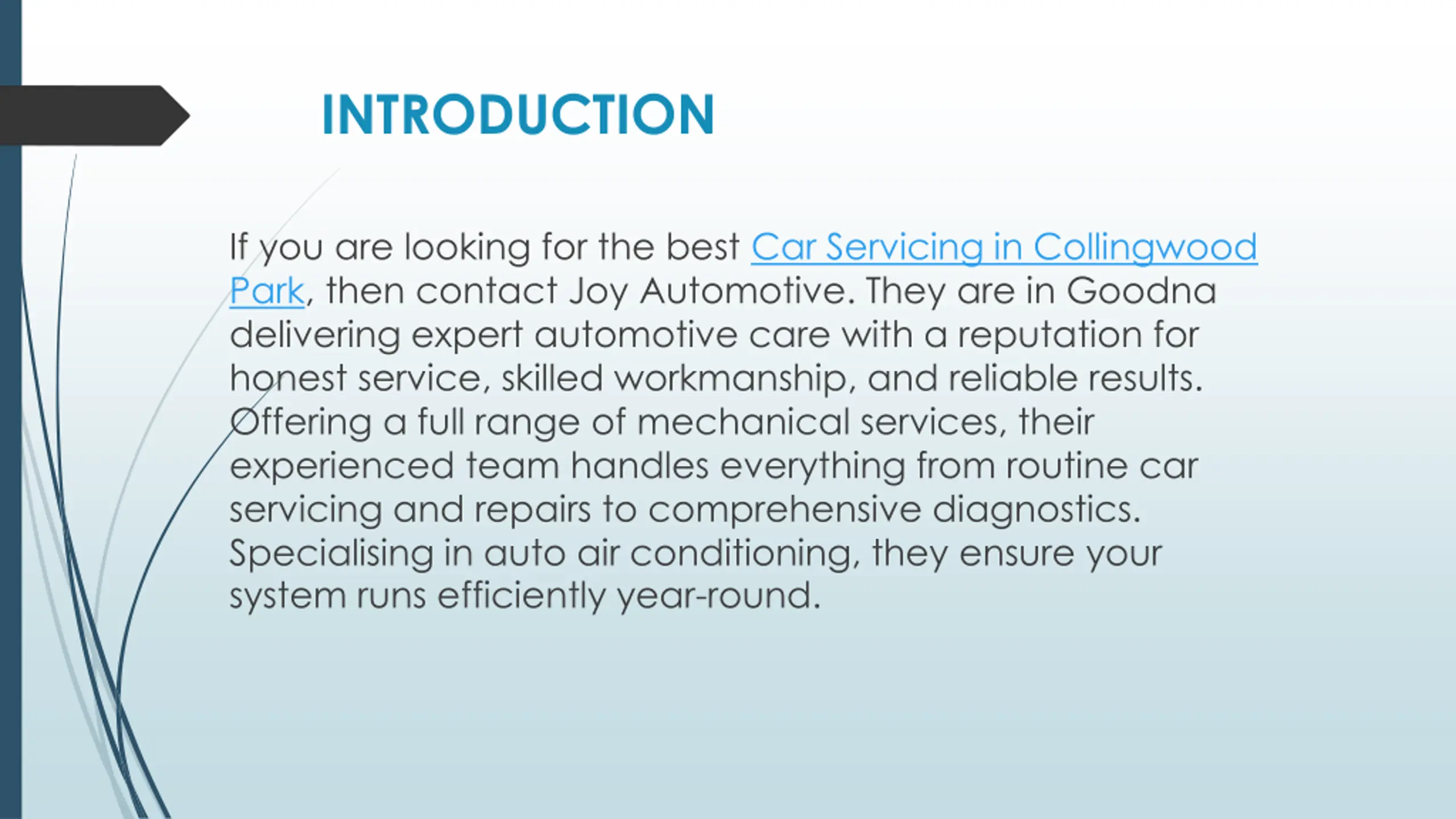 2. INTRODUCTION If you are looking for the best Car Servicing in Collingwood Park, then contact Joy Automotive. They are in Goodna delivering expert automotive care with a reputation for honest service, skilled workmanship, and reliable results. Offering a full range of mechanical services, their experienced team handles everything from routine car servicing and repairs to comprehensive diagnostics. Specialising in auto air conditioning, they ensure your system runs efficiently year-round.