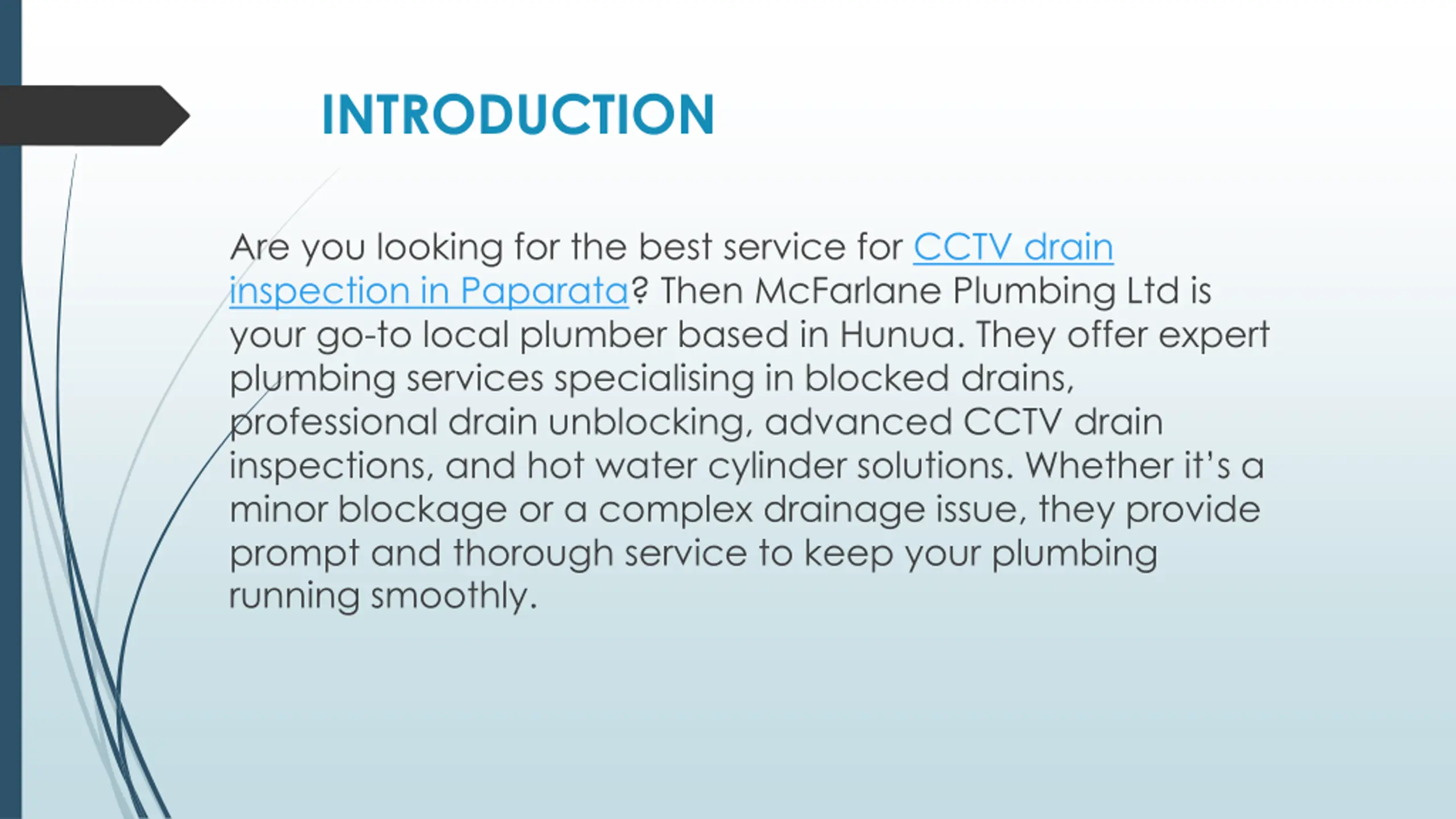 INTRODUCTION Are you looking for the best service for CCTV drain inspection in Paparata? Then McFarlane Plumbing Ltd is your go-to local plumber based in Hunua. They offer expert plumbing services specialising in blocked drains, professional drain unblocking, advanced CCTV drain inspections, and hot water cylinder solutions. Whether it s a minor blockage or a complex drainage issue, they provide prompt and thorough service to keep your plumbing running smoothly.