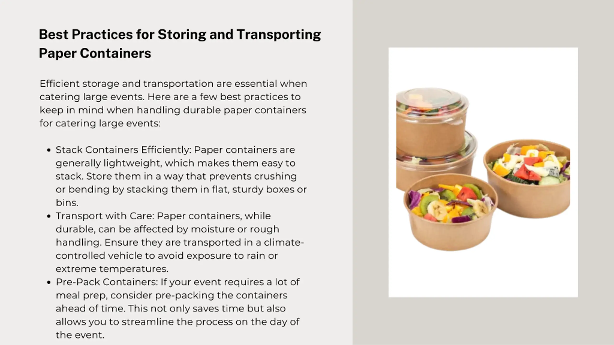 Best Practices for Storing and Transporting Paper Containers Efficient storage and transportation are essential when catering large events. Here are a few best practices to keep in mind when handling durable paper containers for catering large events: Stack Containers Efficiently: Paper containers are generally lightweight, which makes them easy to stack. Store them in a way that prevents crushing or bending by stacking them in flat, sturdy boxes or bins. Transport with Care: Paper containers, while durable, can be affected by moisture or rough handling. Ensure they are transported in a climate- controlled vehicle to avoid exposure to rain or extreme temperatures. Pre-Pack Containers: If your event requires a lot of meal prep, consider pre-packing the containers ahead of time. This not only saves time but also allows you to streamline the process on the day of the event.