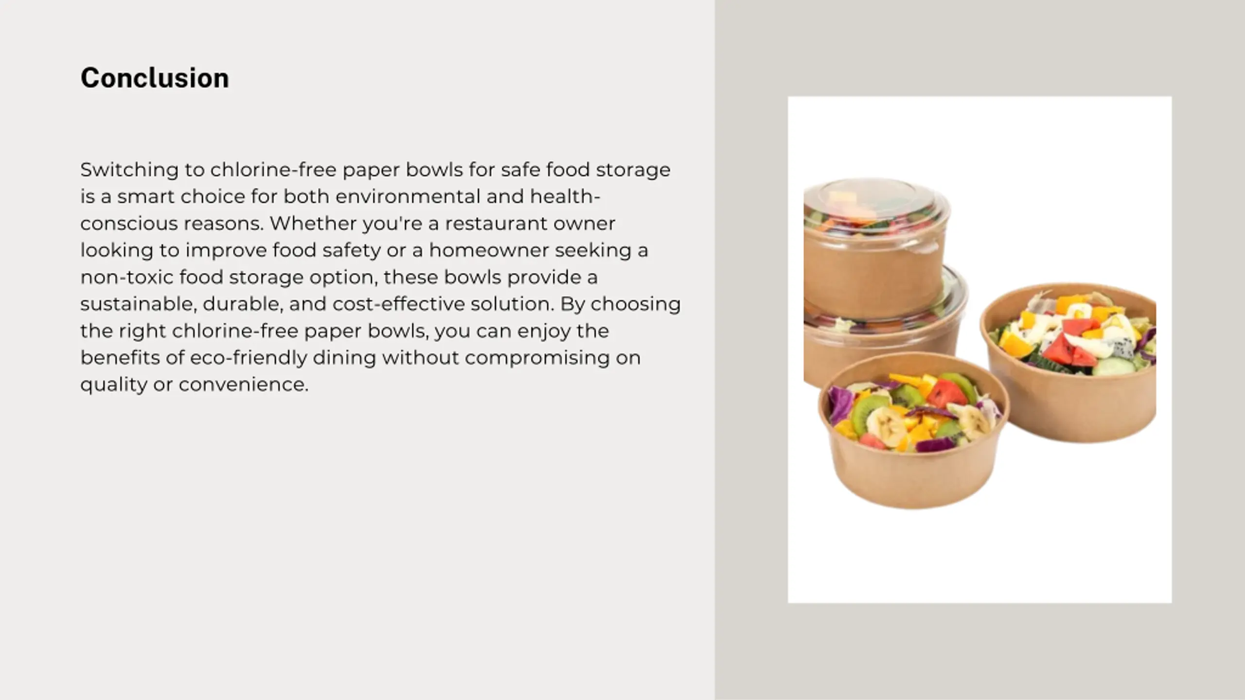 Conclusion Switching to chlorine-free paper bowls for safe food storage is a smart choice for both environmental and health- conscious reasons. Whether you're a restaurant owner looking to improve food safety or a homeowner seeking a non-toxic food storage option, these bowls provide a sustainable, durable, and cost-effective solution. By choosing the right chlorine-free paper bowls, you can enjoy the benefits of eco-friendly dining without compromising on quality or convenience.
