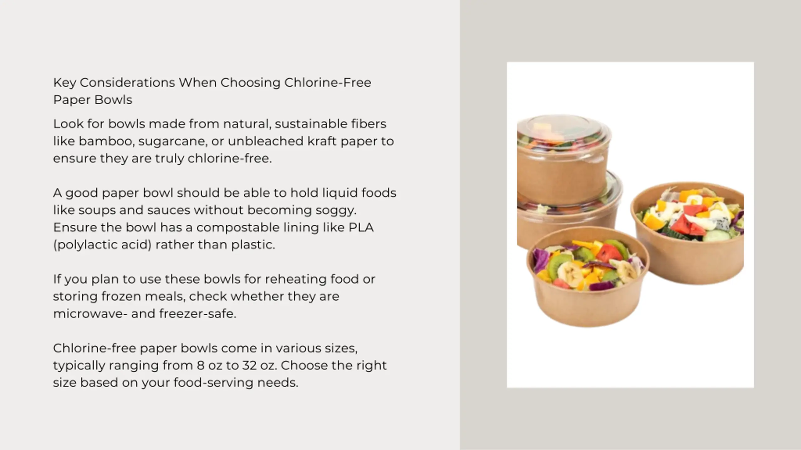 Key Considerations When Choosing Chlorine-Free Paper Bowls Look for bowls made from natural, sustainable fibers like bamboo, sugarcane, or unbleached kraft paper to ensure they are truly chlorine-free. A good paper bowl should be able to hold liquid foods like soups and sauces without becoming soggy. Ensure the bowl has a compostable lining like PLA (polylactic acid) rather than plastic. If you plan to use these bowls for reheating food or storing frozen meals, check whether they are microwave- and freezer-safe. Chlorine-free paper bowls come in various sizes, typically ranging from 8 oz to 32 oz. Choose the right size based on your food-serving needs.