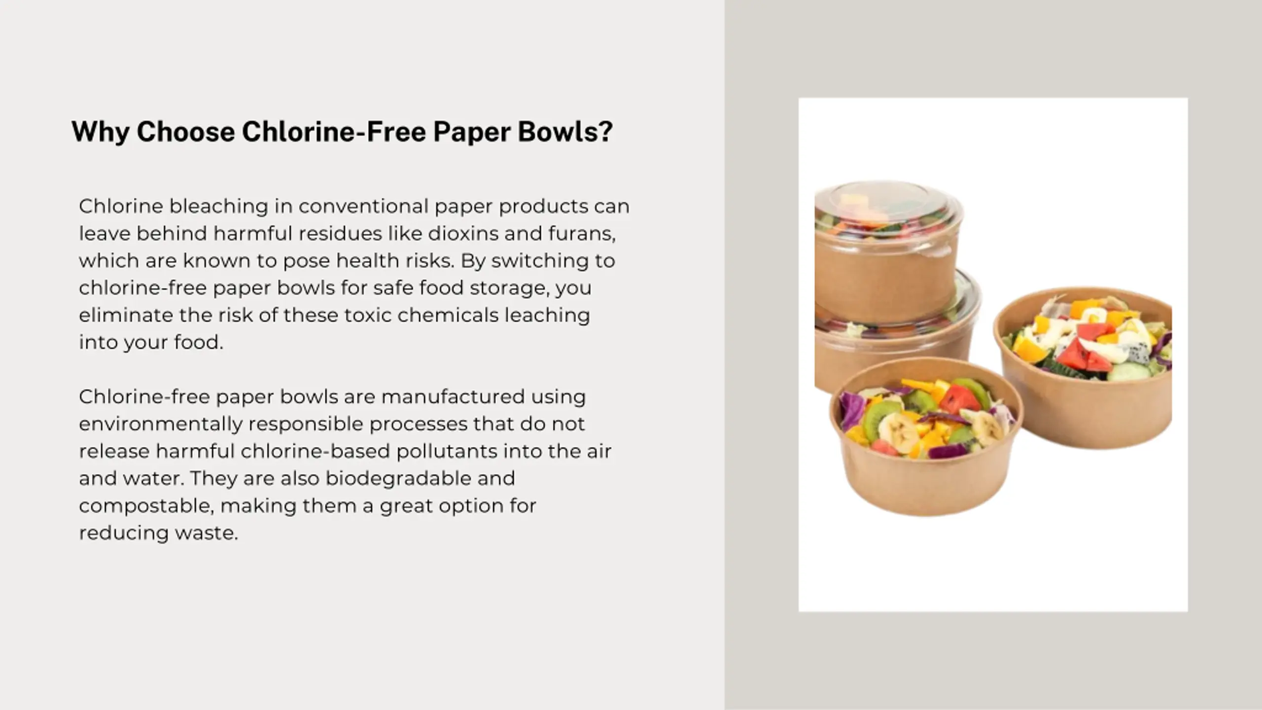 Why Choose Chlorine-Free Paper Bowls? Chlorine bleaching in conventional paper products can leave behind harmful residues like dioxins and furans, which are known to pose health risks. By switching to chlorine-free paper bowls for safe food storage, you eliminate the risk of these toxic chemicals leaching into your food. Chlorine-free paper bowls are manufactured using environmentally responsible processes that do not release harmful chlorine-based pollutants into the air and water. They are also biodegradable and compostable, making them a great option for reducing waste.