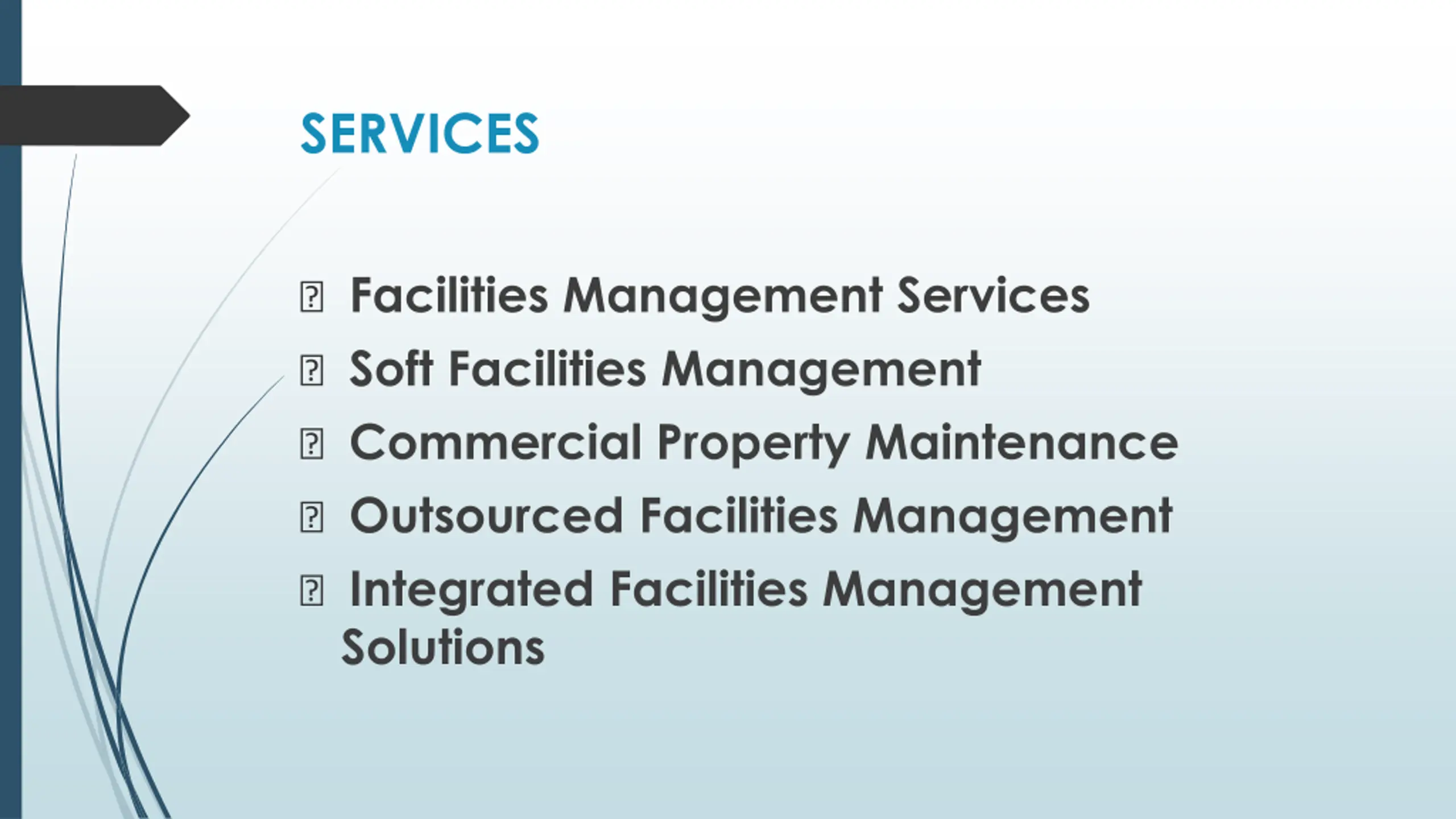 SERVICES ? Facilities Management Services ? Soft Facilities Management ? Commercial Property Maintenance ? Outsourced Facilities Management ? Integrated Facilities Management Solutions