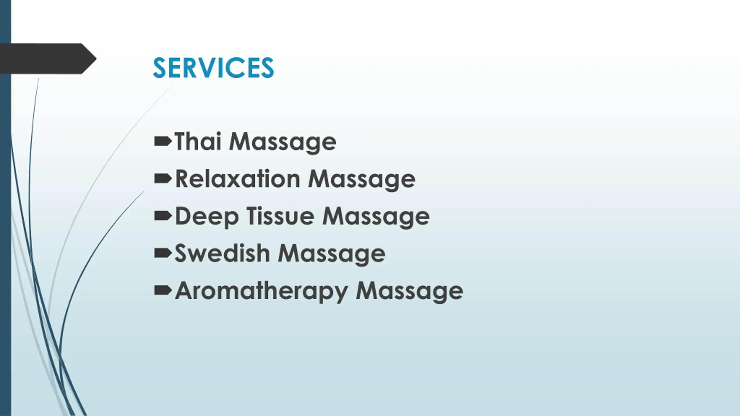 SERVICES Thai Massage Relaxation Massage Deep Tissue Massage Swedish Massage Aromatherapy Massage