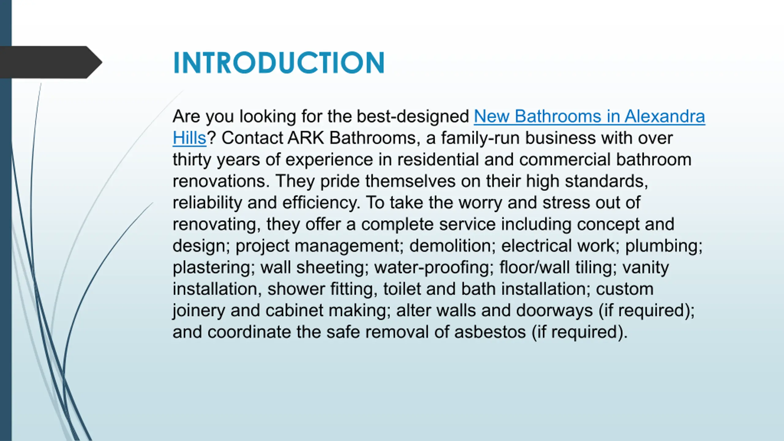 INTRODUCTION Are you looking for the best-designed New Bathrooms in Alexandra Hills? Contact ARK Bathrooms, a family-run business with over thirty years of experience in residential and commercial bathroom renovations. They pride themselves on their high standards, reliability and efficiency. To take the worry and stress out of renovating, they offer a complete service including concept and design; project management; demolition; electrical work; plumbing; plastering; wall sheeting; water-proofing; floor/wall tiling; vanity installation, shower fitting, toilet and bath installation; custom joinery and cabinet making; alter walls and doorways (if required); and coordinate the safe removal of asbestos (if required).