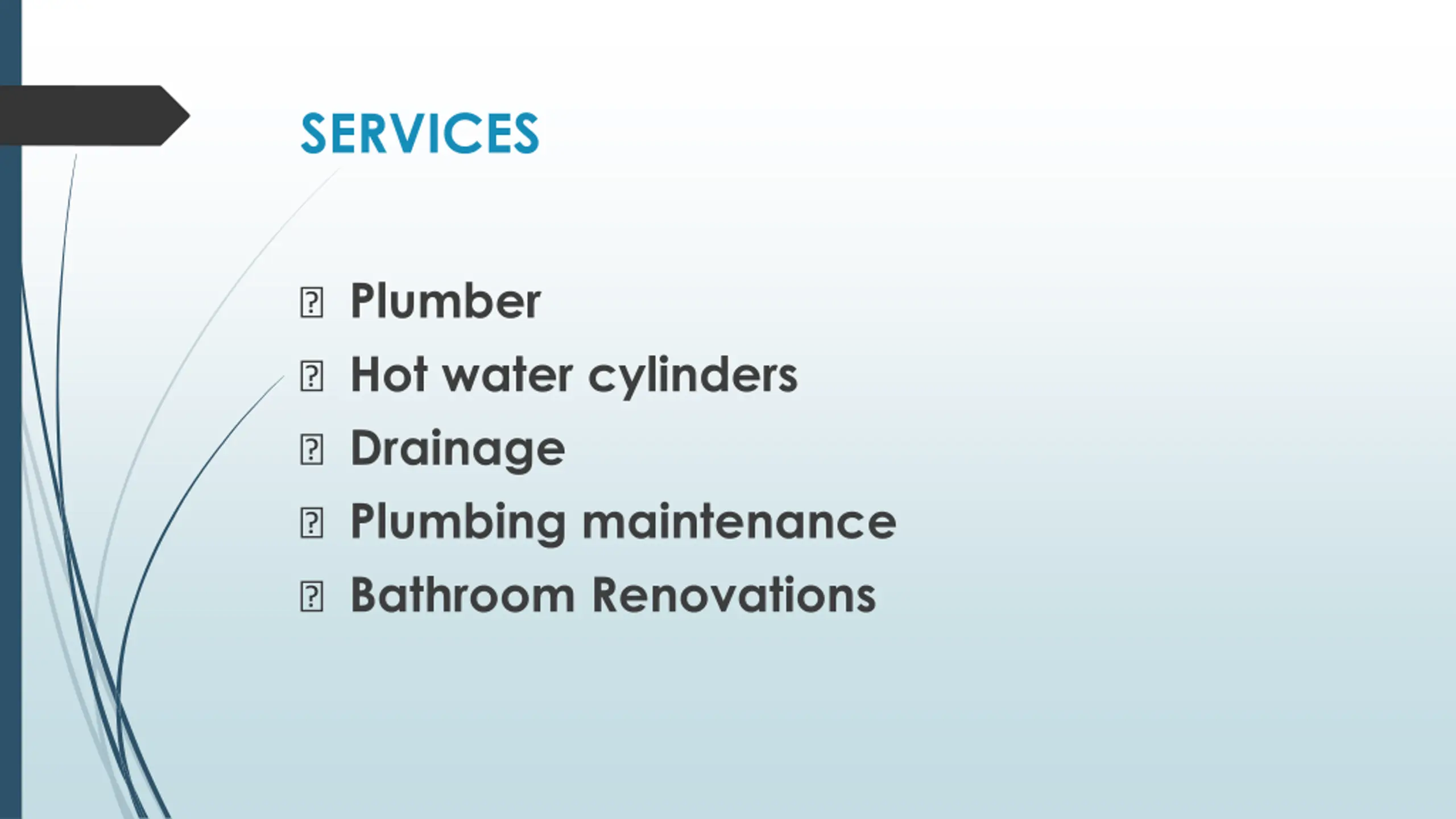 SERVICES ? Plumber ? Hot water cylinders ? Drainage ? Plumbing maintenance ? Bathroom Renovations