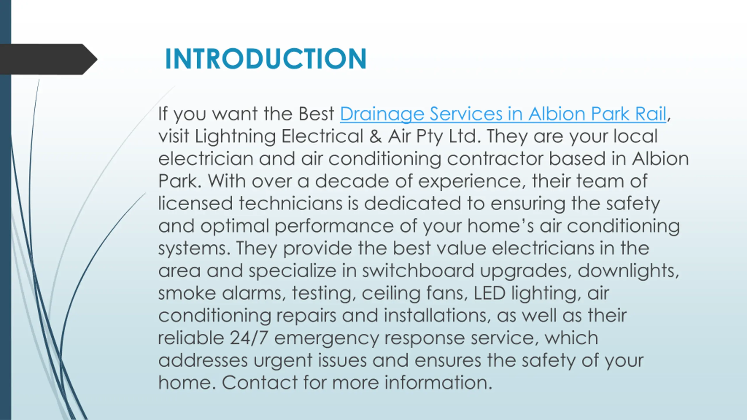 2. INTRODUCTION If you want the Best Drainage Services in Albion Park Rail, visit Lightning Electrical & Air Pty Ltd. They are your local electrician and air conditioning contractor based in Albion Park. With over a decade of experience, their team of licensed technicians is dedicated to ensuring the safety and optimal performance of your home s air conditioning systems. They provide the best value electricians in the area and specialize in switchboard upgrades, downlights, smoke alarms, testing, ceiling fans, LED lighting, air conditioning repairs and installations, as well as their reliable 24/7 emergency response service, which addresses urgent issues and ensures the safety of your home. Contact for more information.