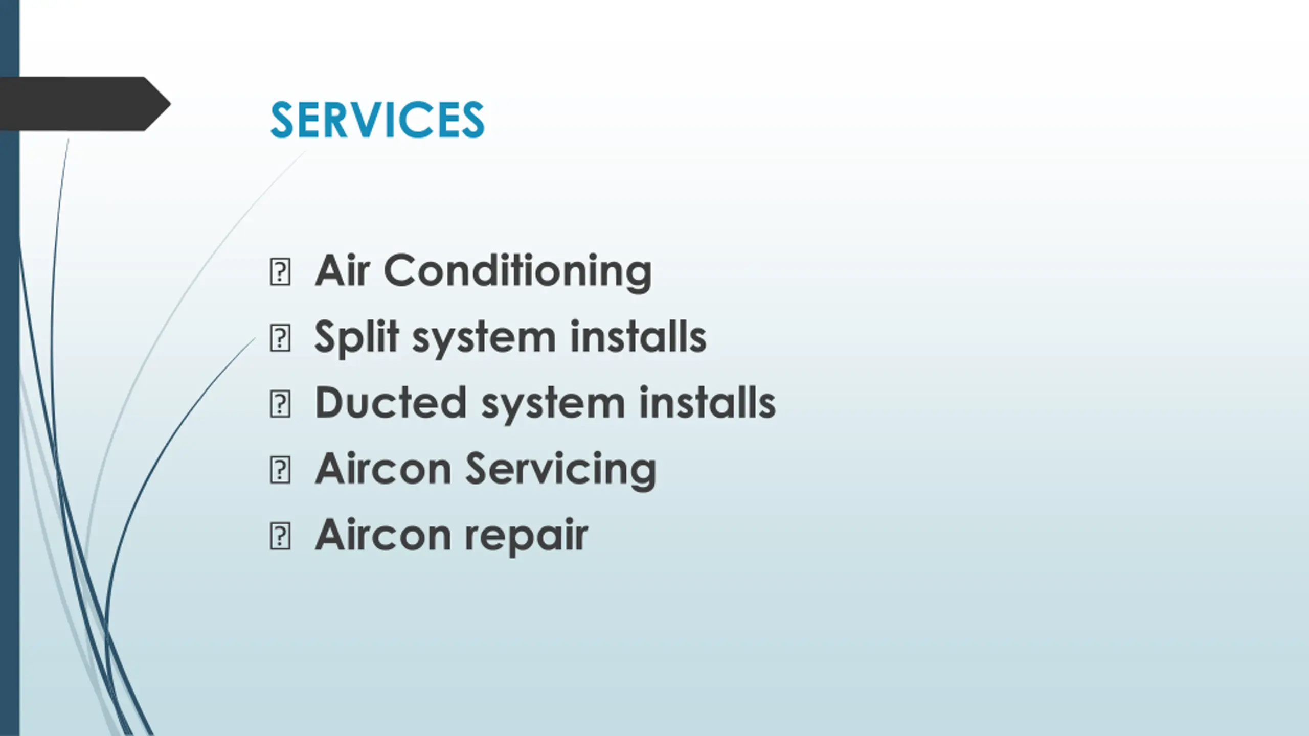 SERVICES ? Air Conditioning ? Split system installs ? Ducted system installs ? Aircon Servicing ? Aircon repair