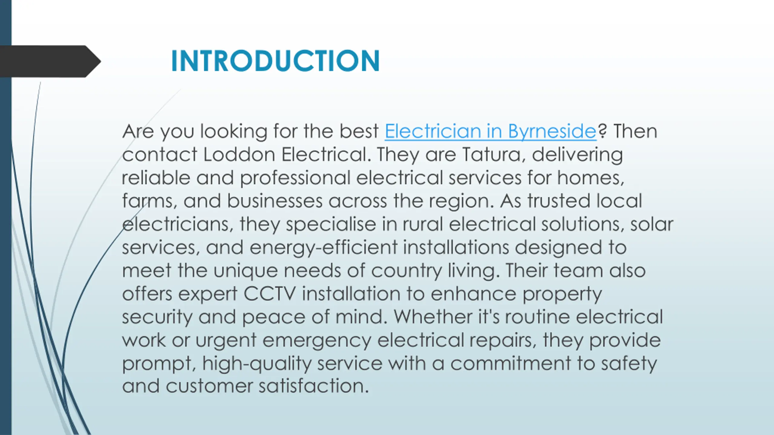 INTRODUCTION Are you looking for the best Electrician in Byrneside? Then contact Loddon Electrical. They are Tatura, delivering reliable and professional electrical services for homes, farms, and businesses across the region. As trusted local electricians, they specialise in rural electrical solutions, solar services, and energy-efficient installations designed to meet the unique needs of country living. Their team also offers expert CCTV installation to enhance property security and peace of mind. Whether it's routine electrical work or urgent emergency electrical repairs, they provide prompt, high-quality service with a commitment to safety and customer satisfaction.