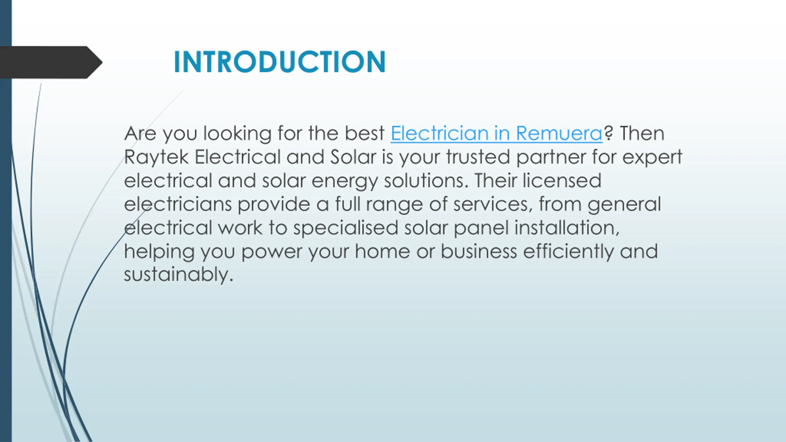 INTRODUCTION Are you looking for the best Electrician in Remuera? Then Raytek Electrical and Solar is your trusted partner for expert electrical and solar energy solutions. Their licensed electricians provide a full range of services, from general electrical work to specialised solar panel installation, helping you power your home or business efficiently and sustainably.