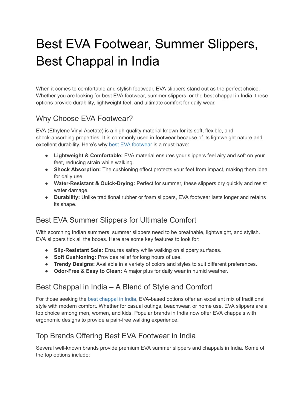 Best EVA Footwear, Summer Slippers, Best Chappal in India When it comes to comfortable and stylish footwear, EVA slippers stand out as the perfect choice. Whether you are looking for best EVA footwear, summer slippers, or the best chappal in India, these options provide durability, lightweight feel, and ultimate comfort for daily wear. Why Choose EVA Footwear? EVA (Ethylene Vinyl Acetate) is a high-quality material known for its soft, flexible, and shock-absorbing properties. It is commonly used in footwear because of its lightweight nature and excellent durability. Here s why best EVA footwear is a must-have: Lightweight & Comfortable: EVA material ensures your slippers feel airy and soft on your feet, reducing strain while walking. Shock Absorption: The cushioning effect protects your feet from impact, making them ideal for daily use. Water-Resistant & Quick-Drying: Perfect for summer, these slippers dry quickly and resist water damage. Durability: Unlike traditional rubber or foam slippers, EVA footwear lasts longer and retains its shape. Best EVA Summer Slippers for Ultimate Comfort With scorching Indian summers, summer slippers need to be breathable, lightweight, and stylish. EVA slippers tick all the boxes. Here are some key features to look for: Slip-Resistant Sole: Ensures safety while walking on slippery surfaces. Soft Cushioning: Provides relief for long hours of use. Trendy Designs: Available in a variety of colors and styles to suit different preferences. Odor-Free & Easy to Clean: A major plus for daily wear in humid weather. Best Chappal in India A Blend of Style and Comfort For those seeking the best chappal in India, EVA-based options offer an excellent mix of traditional style with modern comfort. Whether for casual outings, beachwear, or home use, EVA slippers are a top choice among men, women, and kids. Popular brands in India now offer EVA chappals with ergonomic designs to provide a pain-free walking experience. Top Brands Offering Best EVA Footwear in India Several well-known brands provide premium EVA summer slippers and chappals in India. Some of the top options include: