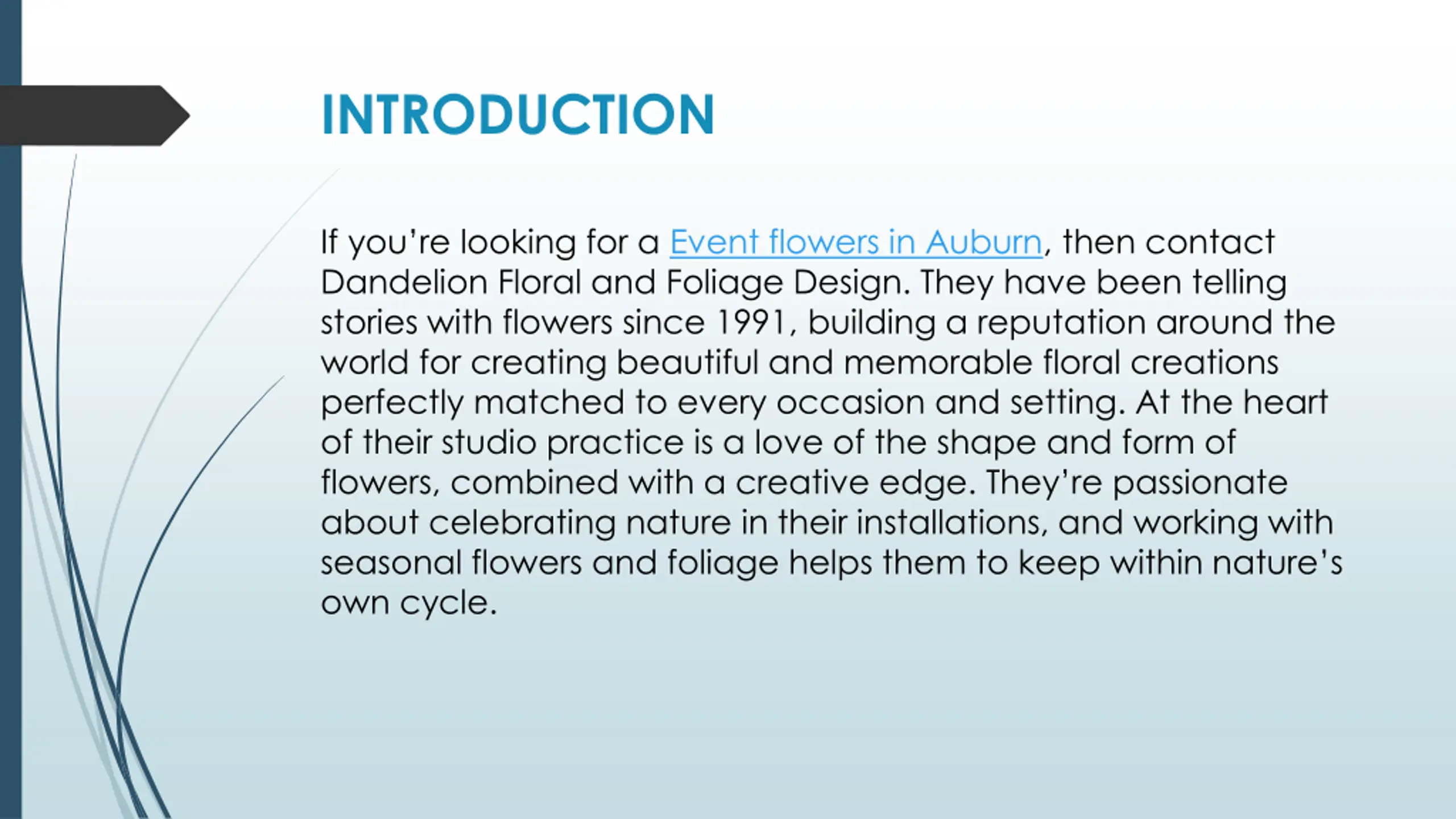 INTRODUCTION If you re looking for a Event flowers in Auburn, then contact Dandelion Floral and Foliage Design. They have been telling stories with flowers since 1991, building a reputation around the world for creating beautiful and memorable floral creations perfectly matched to every occasion and setting. At the heart of their studio practice is a love of the shape and form of flowers, combined with a creative edge. They re passionate about celebrating nature in their installations, and working with seasonal flowers and foliage helps them to keep within nature s own cycle.