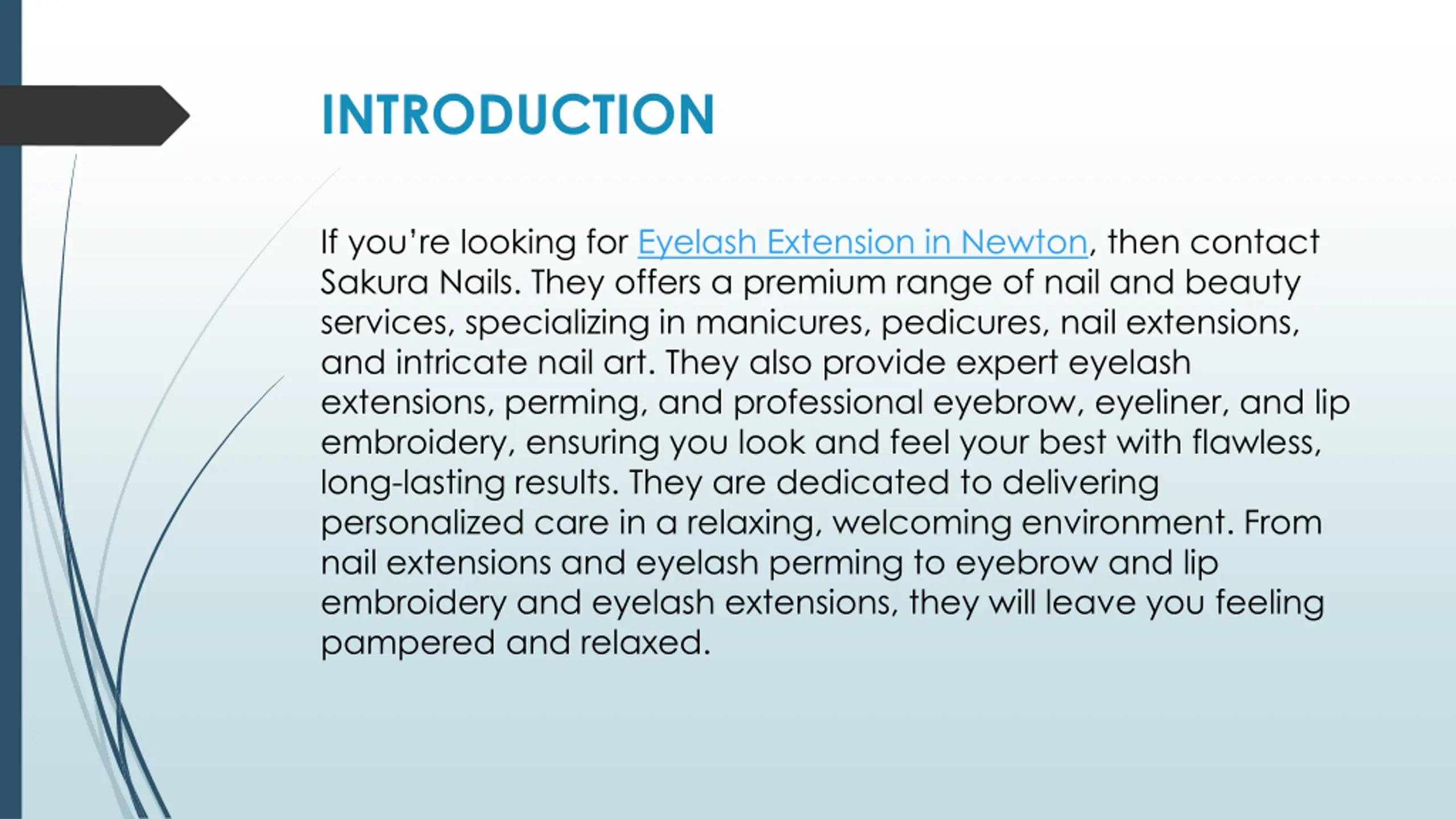 INTRODUCTION If you re looking for Eyelash Extension in Newton, then contact Sakura Nails. They offers a premium range of nail and beauty services, specializing in manicures, pedicures, nail extensions, and intricate nail art. They also provide expert eyelash extensions, perming, and professional eyebrow, eyeliner, and lip embroidery, ensuring you look and feel your best with flawless, long-lasting results. They are dedicated to delivering personalized care in a relaxing, welcoming environment. From nail extensions and eyelash perming to eyebrow and lip embroidery and eyelash extensions, they will leave you feeling pampered and relaxed.