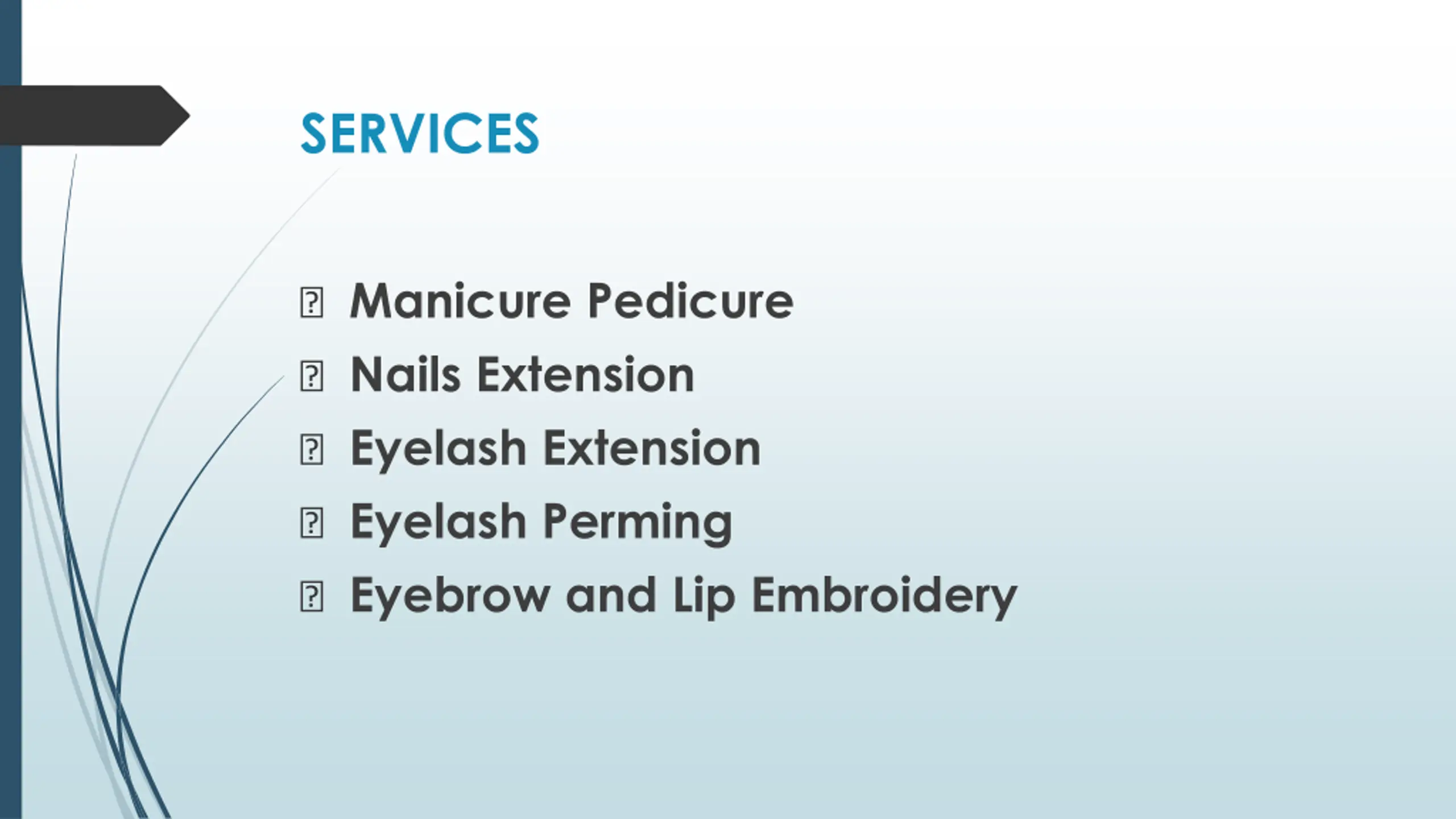 SERVICES ? Manicure Pedicure ? Nails Extension ? Eyelash Extension ? Eyelash Perming ? Eyebrow and Lip Embroidery