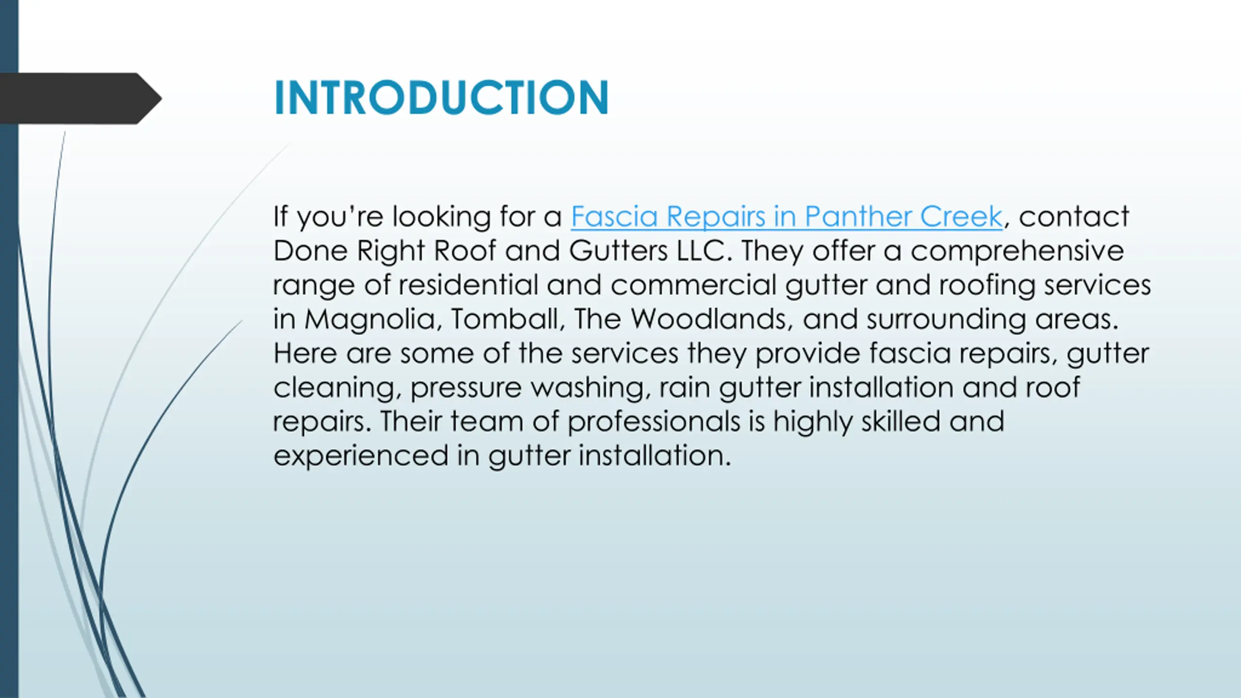 INTRODUCTION If you re looking for a Fascia Repairs in Panther Creek, contact Done Right Roof and Gutters LLC. They offer a comprehensive range of residential and commercial gutter and roofing services in Magnolia, Tomball, The Woodlands, and surrounding areas. Here are some of the services they provide fascia repairs, gutter cleaning, pressure washing, rain gutter installation and roof repairs. Their team of professionals is highly skilled and experienced in gutter installation.