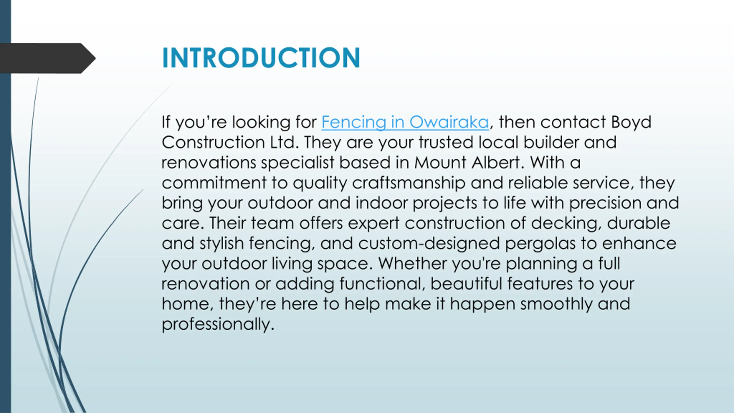 INTRODUCTION If you re looking for Fencing in Owairaka, then contact Boyd Construction Ltd. They are your trusted local builder and renovations specialist based in Mount Albert. With a commitment to quality craftsmanship and reliable service, they bring your outdoor and indoor projects to life with precision and care. Their team offers expert construction of decking, durable and stylish fencing, and custom-designed pergolas to enhance your outdoor living space. Whether you're planning a full renovation or adding functional, beautiful features to your home, they re here to help make it happen smoothly and professionally.