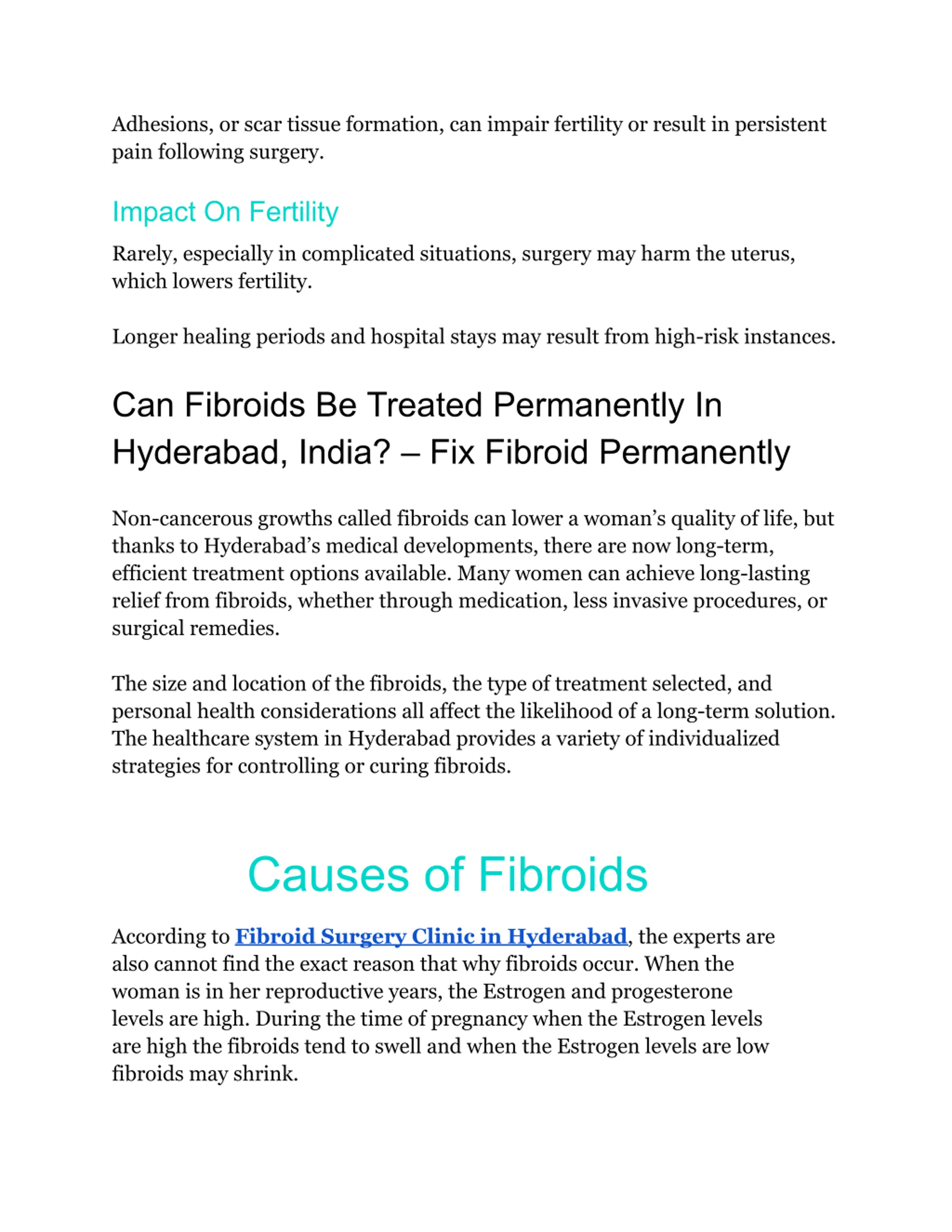 Adhesions, or scar tissue formation, can impair fertility or result in persistent pain following surgery. Impact On Fertility Rarely, especially in complicated situations, surgery may harm the uterus, which lowers fertility. Longer healing periods and hospital stays may result from high-risk instances. Can Fibroids Be Treated Permanently In Hyderabad, India? Fix Fibroid Permanently Non-cancerous growths called fibroids can lower a woman s quality of life, but thanks to Hyderabad s medical developments, there are now long-term, efficient treatment options available. Many women can achieve long-lasting relief from fibroids, whether through medication, less invasive procedures, or surgical remedies. The size and location of the fibroids, the type of treatment selected, and personal health considerations all affect the likelihood of a long-term solution. The healthcare system in Hyderabad provides a variety of individualized strategies for controlling or curing fibroids. Causes of Fibroids According to Fibroid Surgery Clinic in Hyderabad, the experts are also cannot find the exact reason that why fibroids occur. When the woman is in her reproductive years, the Estrogen and progesterone levels are high. During the time of pregnancy when the Estrogen levels are high the fibroids tend to swell and when the Estrogen levels are low fibroids may shrink.