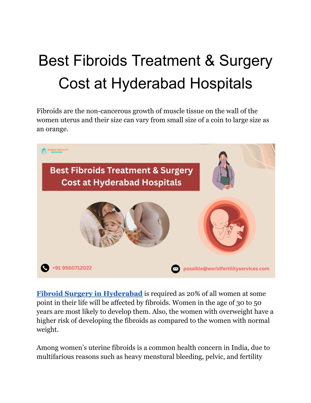 Find World Fertility Services' Best Fibroids Treatment & Surgery Costs at Hyderabad Hospitals. We provide innovative, reasonably priced solutions that are suited to your medical requirements. Modern methods are employed by our skilled gynecologists t