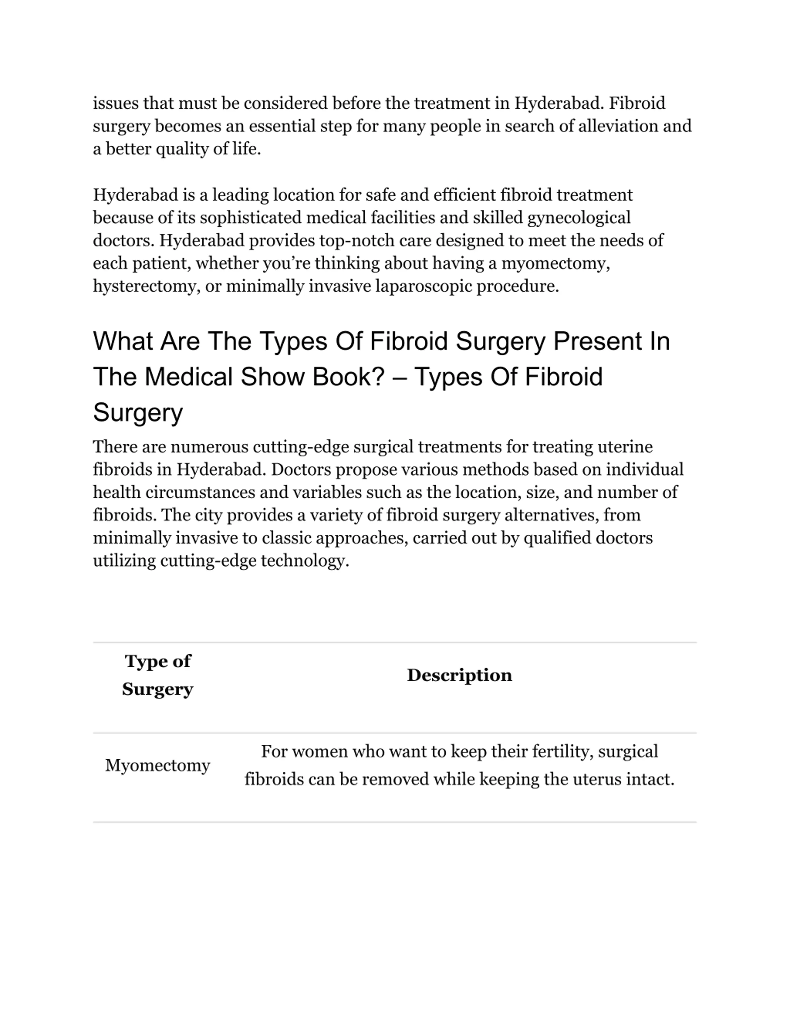 issues that must be considered before the treatment in Hyderabad. Fibroid surgery becomes an essential step for many people in search of alleviation and a better quality of life. Hyderabad is a leading location for safe and efficient fibroid treatment because of its sophisticated medical facilities and skilled gynecological doctors. Hyderabad provides top-notch care designed to meet the needs of each patient, whether you re thinking about having a myomectomy, hysterectomy, or minimally invasive laparoscopic procedure. What Are The Types Of Fibroid Surgery Present In The Medical Show Book? Types Of Fibroid Surgery There are numerous cutting-edge surgical treatments for treating uterine fibroids in Hyderabad. Doctors propose various methods based on individual health circumstances and variables such as the location, size, and number of fibroids. The city provides a variety of fibroid surgery alternatives, from minimally invasive to classic approaches, carried out by qualified doctors utilizing cutting-edge technology. Type of Surgery Description For women who want to keep their fertility, surgical fibroids can be removed while keeping the uterus intact. Myomectomy