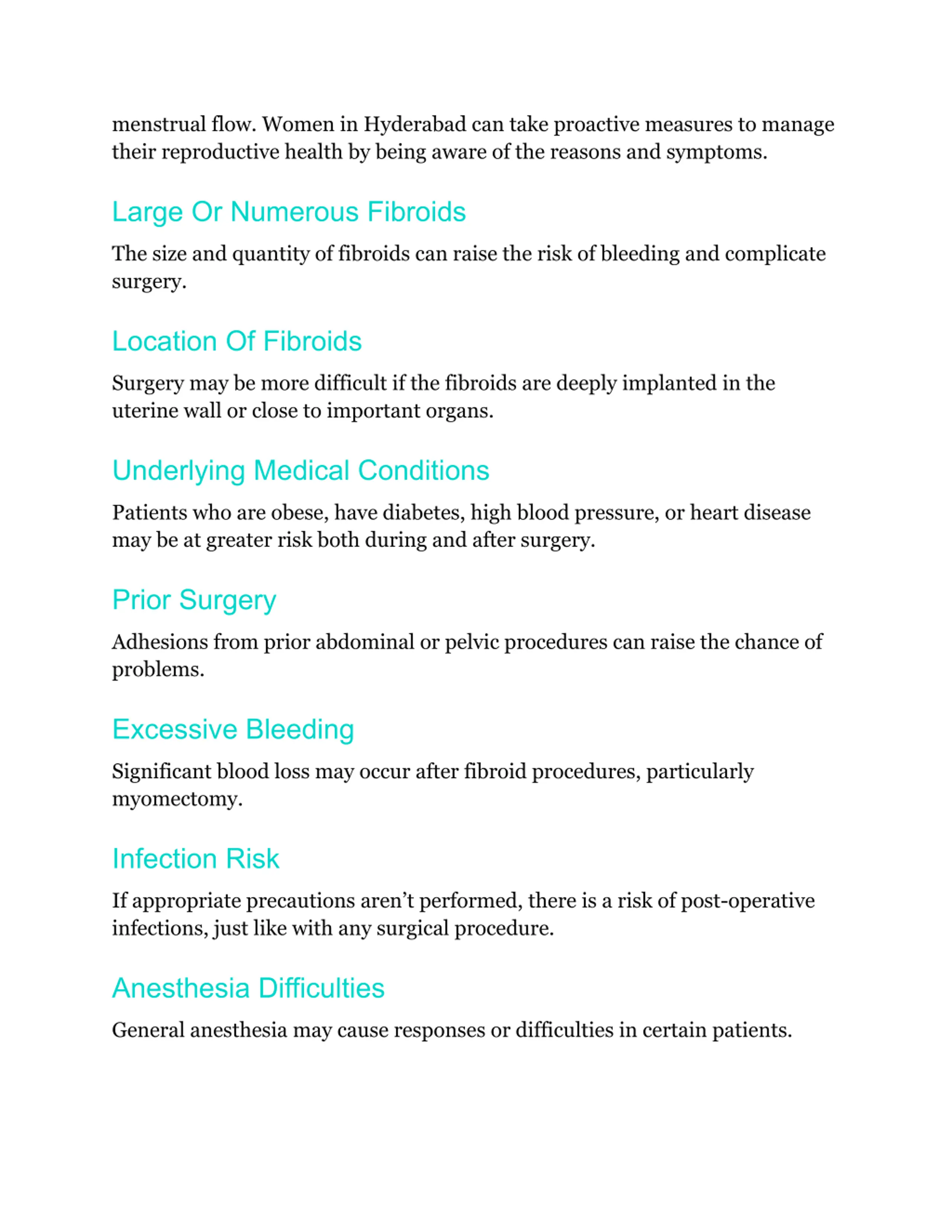 menstrual flow. Women in Hyderabad can take proactive measures to manage their reproductive health by being aware of the reasons and symptoms. Large Or Numerous Fibroids The size and quantity of fibroids can raise the risk of bleeding and complicate surgery. Location Of Fibroids Surgery may be more difficult if the fibroids are deeply implanted in the uterine wall or close to important organs. Underlying Medical Conditions Patients who are obese, have diabetes, high blood pressure, or heart disease may be at greater risk both during and after surgery. Prior Surgery Adhesions from prior abdominal or pelvic procedures can raise the chance of problems. Excessive Bleeding Significant blood loss may occur after fibroid procedures, particularly myomectomy. Infection Risk If appropriate precautions aren t performed, there is a risk of post-operative infections, just like with any surgical procedure. Anesthesia Difficulties General anesthesia may cause responses or difficulties in certain patients.