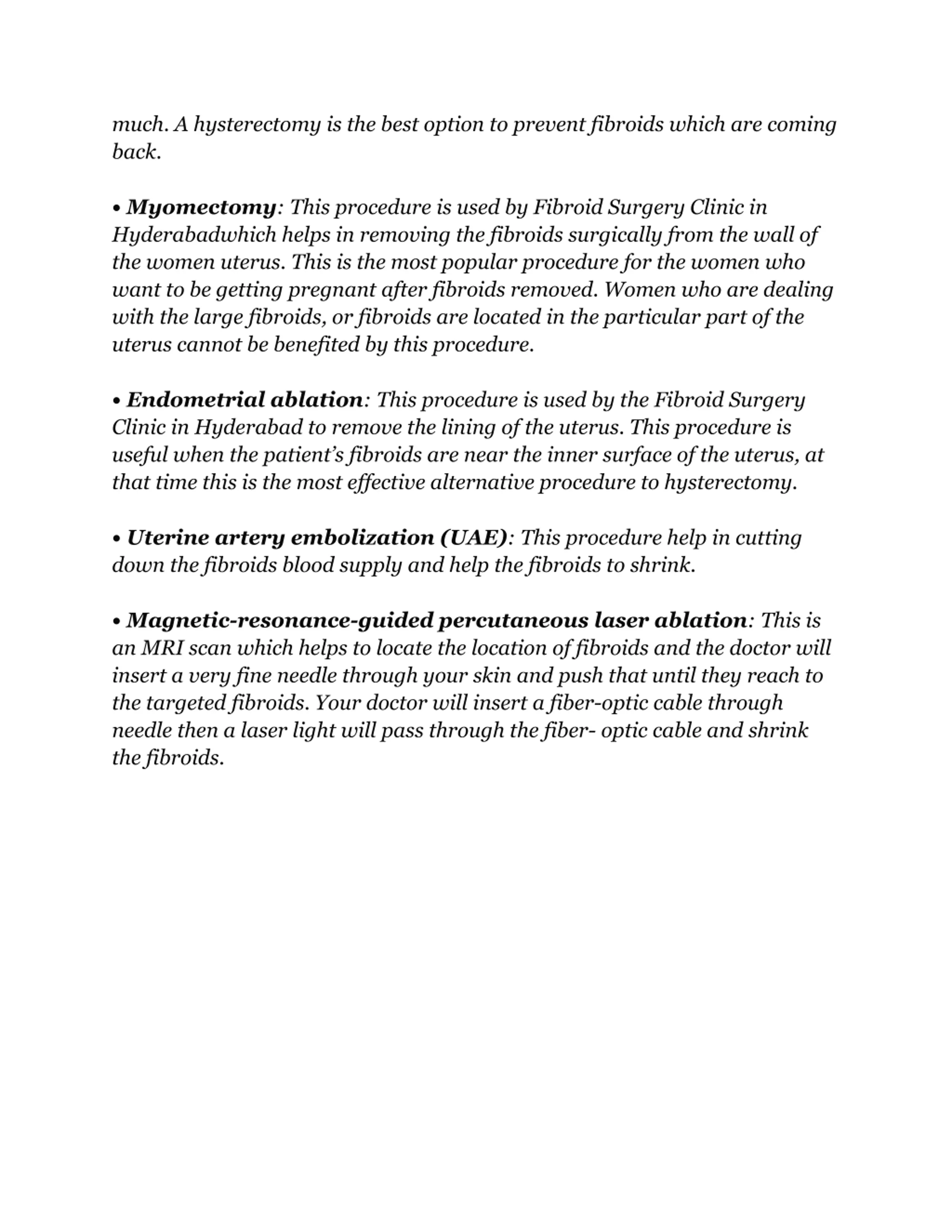 much. A hysterectomy is the best option to prevent fibroids which are coming back. Myomectomy: This procedure is used by Fibroid Surgery Clinic in Hyderabadwhich helps in removing the fibroids surgically from the wall of the women uterus. This is the most popular procedure for the women who want to be getting pregnant after fibroids removed. Women who are dealing with the large fibroids, or fibroids are located in the particular part of the uterus cannot be benefited by this procedure. Endometrial ablation: This procedure is used by the Fibroid Surgery Clinic in Hyderabad to remove the lining of the uterus. This procedure is useful when the patient s fibroids are near the inner surface of the uterus, at that time this is the most effective alternative procedure to hysterectomy. Uterine artery embolization (UAE): This procedure help in cutting down the fibroids blood supply and help the fibroids to shrink. Magnetic-resonance-guided percutaneous laser ablation: This is an MRI scan which helps to locate the location of fibroids and the doctor will insert a very fine needle through your skin and push that until they reach to the targeted fibroids. Your doctor will insert a fiber-optic cable through needle then a laser light will pass through the fiber- optic cable and shrink the fibroids.