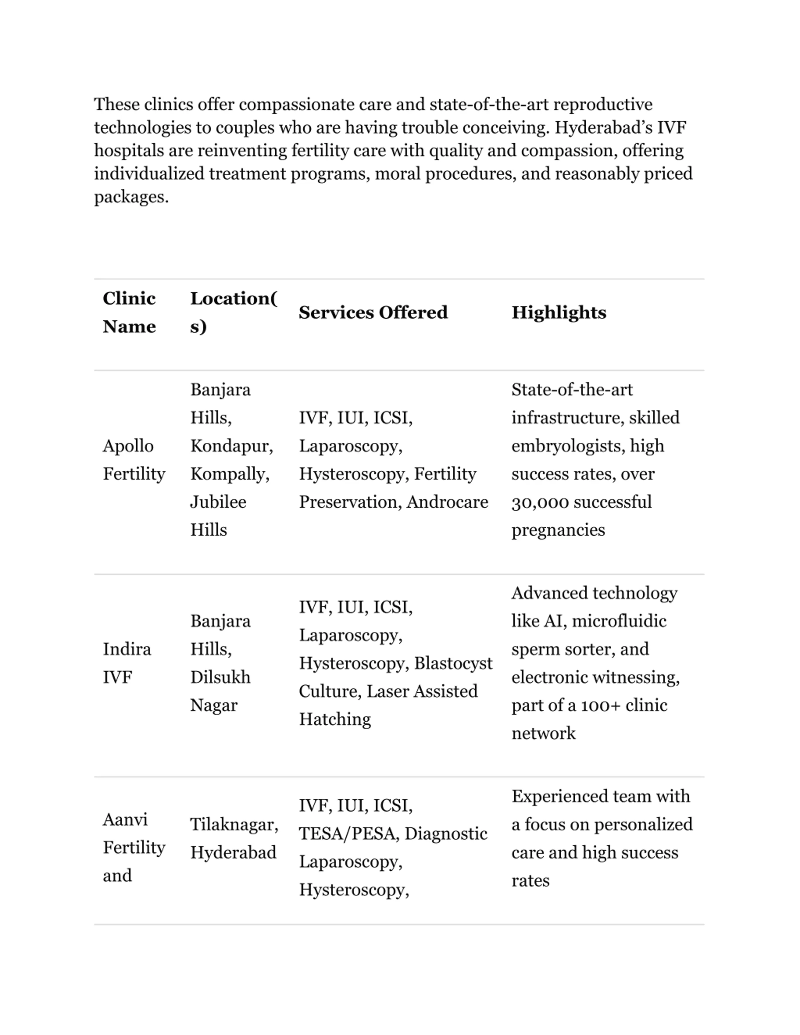 These clinics offer compassionate care and state-of-the-art reproductive technologies to couples who are having trouble conceiving. Hyderabad s IVF hospitals are reinventing fertility care with quality and compassion, offering individualized treatment programs, moral procedures, and reasonably priced packages. Clinic Name Location( s) Services Offered Highlights Banjara Hills, Kondapur, Kompally, Jubilee Hills State-of-the-art infrastructure, skilled embryologists, high success rates, over 30,000 successful pregnancies IVF, IUI, ICSI, Laparoscopy, Hysteroscopy, Fertility Preservation, Androcare Apollo Fertility Advanced technology like AI, microfluidic sperm sorter, and electronic witnessing, part of a 100+ clinic network IVF, IUI, ICSI, Laparoscopy, Hysteroscopy, Blastocyst Culture, Laser Assisted Hatching Banjara Hills, Dilsukh Nagar Indira IVF Experienced team with a focus on personalized care and high success rates IVF, IUI, ICSI, TESA/PESA, Diagnostic Laparoscopy, Hysteroscopy, Aanvi Fertility and Tilaknagar, Hyderabad