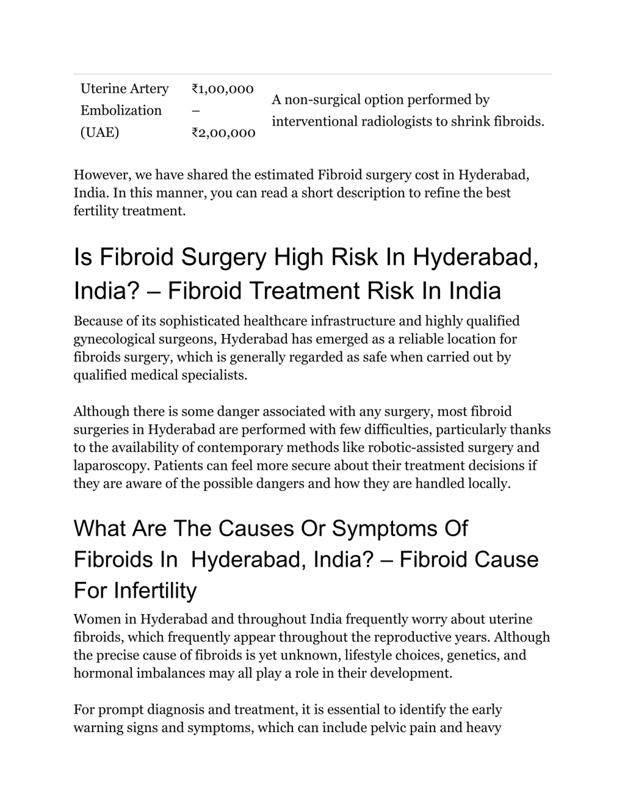 Complete removal of the uterus; a permanent solution for fibroids, often recommended in severe cases or when childbearing is not a concern. Hysterectomy Laparoscopic Surgery A minimally invasive surgery using small incisions and a camera offers quicker recovery and less pain. A hysteroscope can be used to remove fibroids through the cervix and vagina; this method works well for fibroids inside the uterus. Hysteroscopic Myomectomy Advanced, minimally invasive technique using robotic arms for high precision; available at select hospitals in Hyderabad. Robotic Surgery Uterine Artery Embolization (UAE) Interventional radiologists use this non-surgical technique to reduce fibroids by cutting off their blood supply. In the upper case of the table, we have mentioned the types of Fibroid surgery in Hyderabad at an affordable cost. We hope to understand which treatment would be best as per the patient s requirements. What Are The Cost Of Fibroid Surgery In Hyderabad, India? Fertility Cost In India The type of procedure, the hospital or clinic selected, the surgeon s experience, and any other medical services needed can all affect the cost of fibroid surgery in Hyderabad. From upscale private institutions to government hospitals,