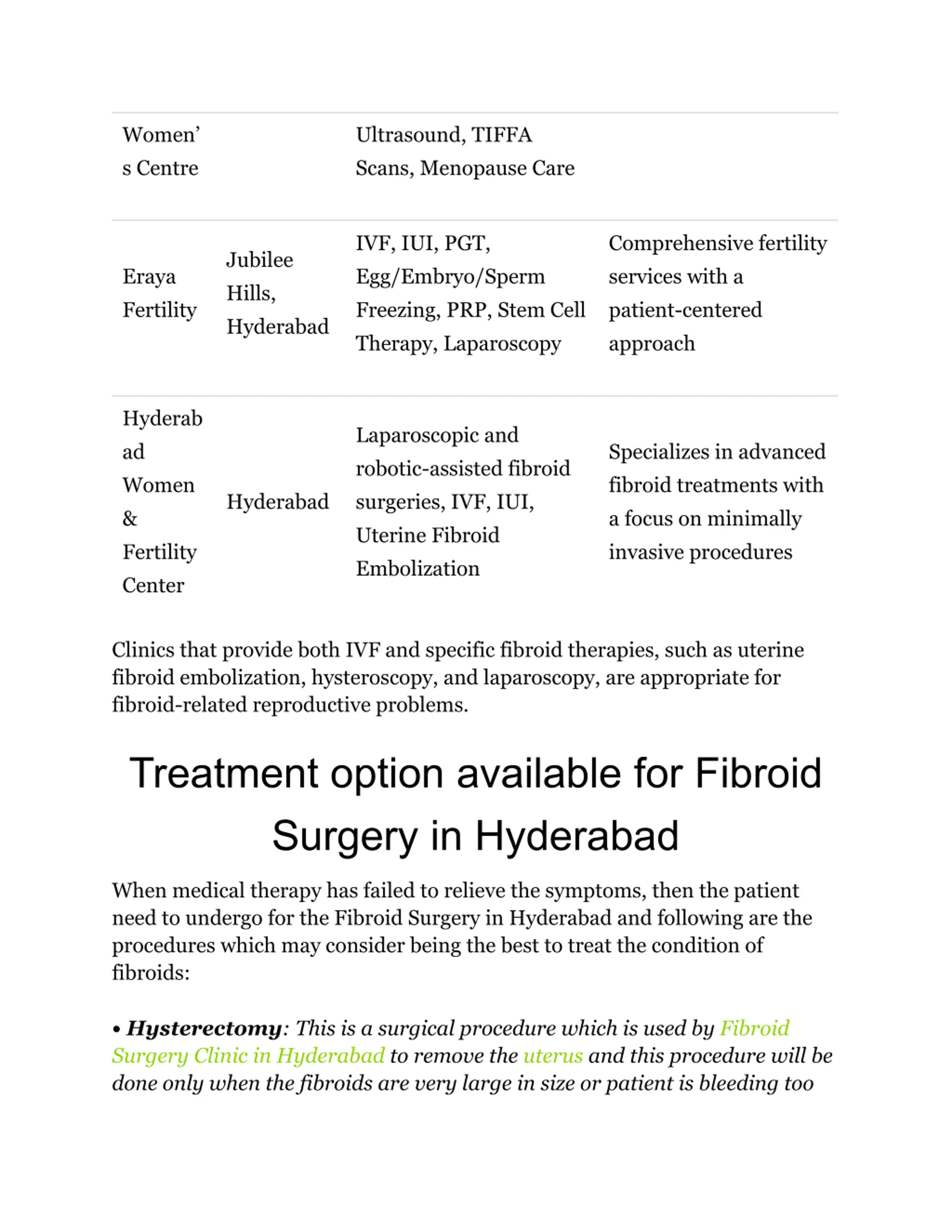 Women s Centre Ultrasound, TIFFA Scans, Menopause Care IVF, IUI, PGT, Egg/Embryo/Sperm Freezing, PRP, Stem Cell Therapy, Laparoscopy Comprehensive fertility services with a patient-centered approach Jubilee Hills, Hyderabad Eraya Fertility Hyderab ad Women & Fertility Center Laparoscopic and robotic-assisted fibroid surgeries, IVF, IUI, Uterine Fibroid Embolization Specializes in advanced fibroid treatments with a focus on minimally invasive procedures Hyderabad Clinics that provide both IVF and specific fibroid therapies, such as uterine fibroid embolization, hysteroscopy, and laparoscopy, are appropriate for fibroid-related reproductive problems. Treatment option available for Fibroid Surgery in Hyderabad When medical therapy has failed to relieve the symptoms, then the patient need to undergo for the Fibroid Surgery in Hyderabad and following are the procedures which may consider being the best to treat the condition of fibroids: Hysterectomy: This is a surgical procedure which is used by Fibroid Surgery Clinic in Hyderabad to remove the uterus and this procedure will be done only when the fibroids are very large in size or patient is bleeding too