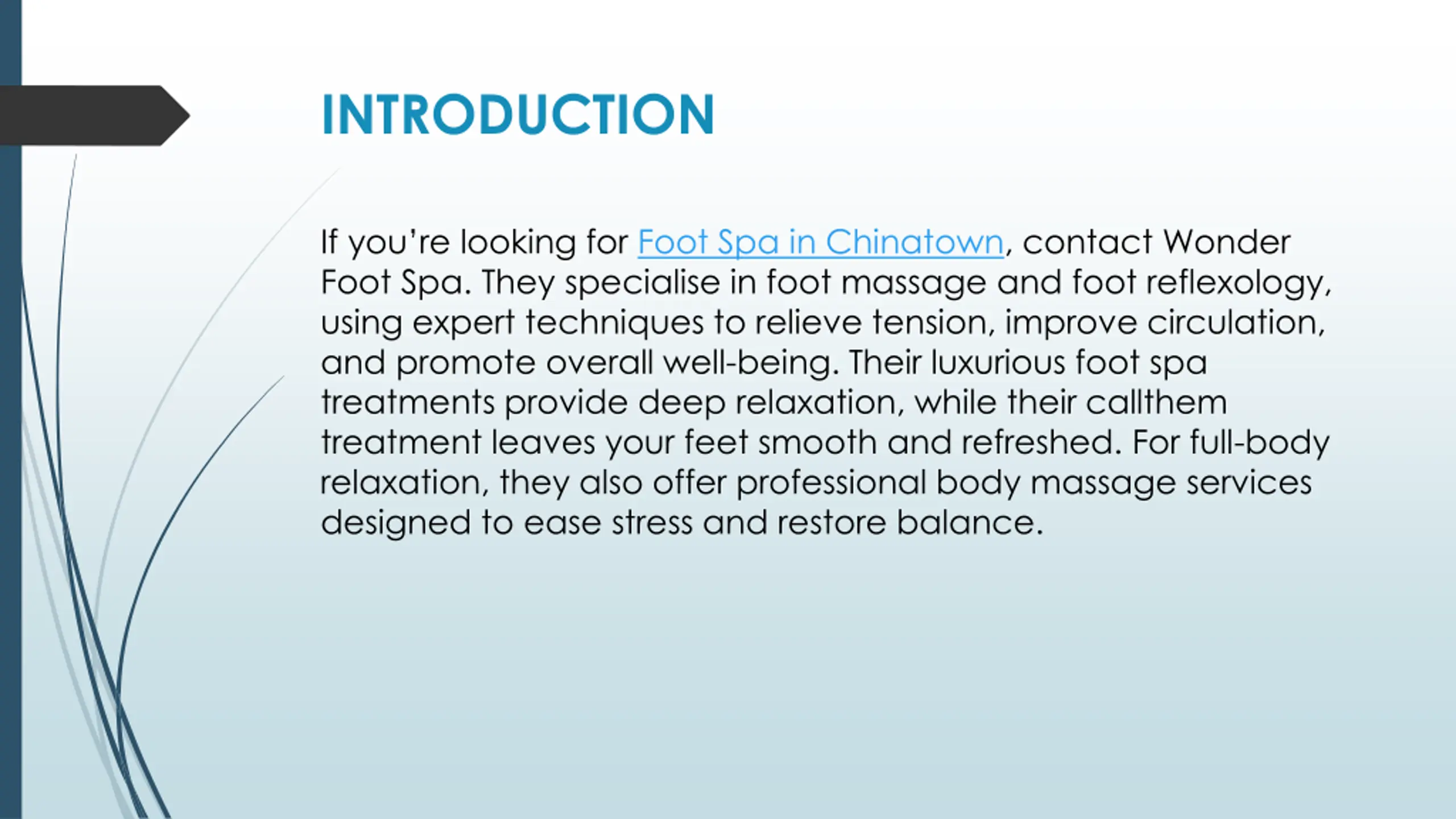 INTRODUCTION If you re looking for Foot Spa in Chinatown, contact Wonder Foot Spa. They specialise in foot massage and foot reflexology, using expert techniques to relieve tension, improve circulation, and promote overall well-being. Their luxurious foot spa treatments provide deep relaxation, while their callthem treatment leaves your feet smooth and refreshed. For full-body relaxation, they also offer professional body massage services designed to ease stress and restore balance.