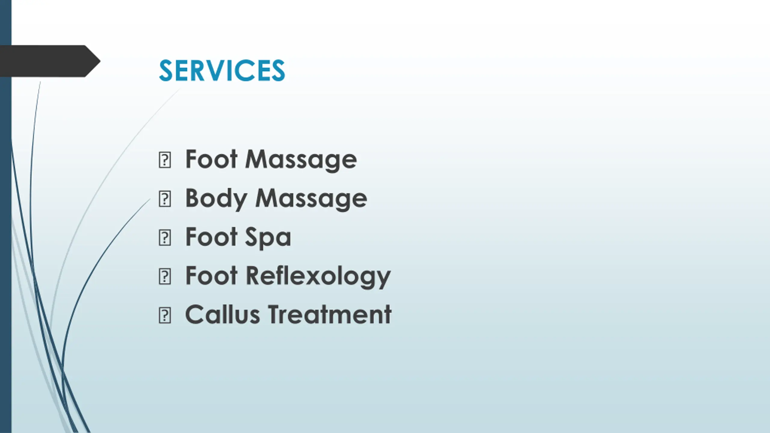 SERVICES ? Foot Massage ? Body Massage ? Foot Spa ? Foot Reflexology ? Callus Treatment