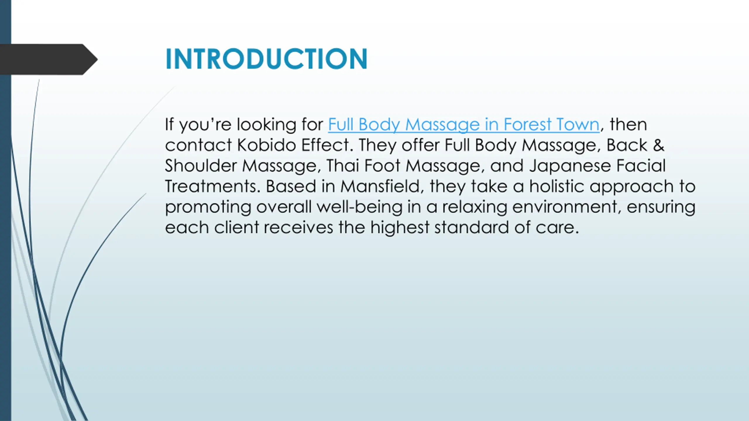 INTRODUCTION If you re looking for Full Body Massage in Forest Town, then contact Kobido Effect. They offer Full Body Massage, Back & Shoulder Massage, Thai Foot Massage, and Japanese Facial Treatments. Based in Mansfield, they take a holistic approach to promoting overall well-being in a relaxing environment, ensuring each client receives the highest standard of care.