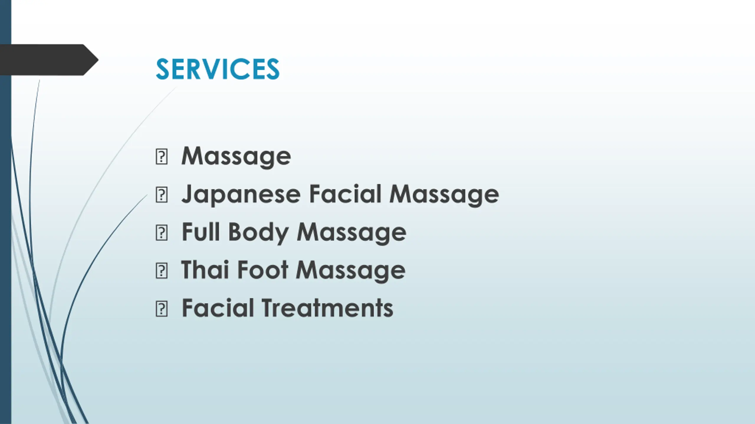 SERVICES ? Massage ? Japanese Facial Massage ? Full Body Massage ? Thai Foot Massage ? Facial Treatments