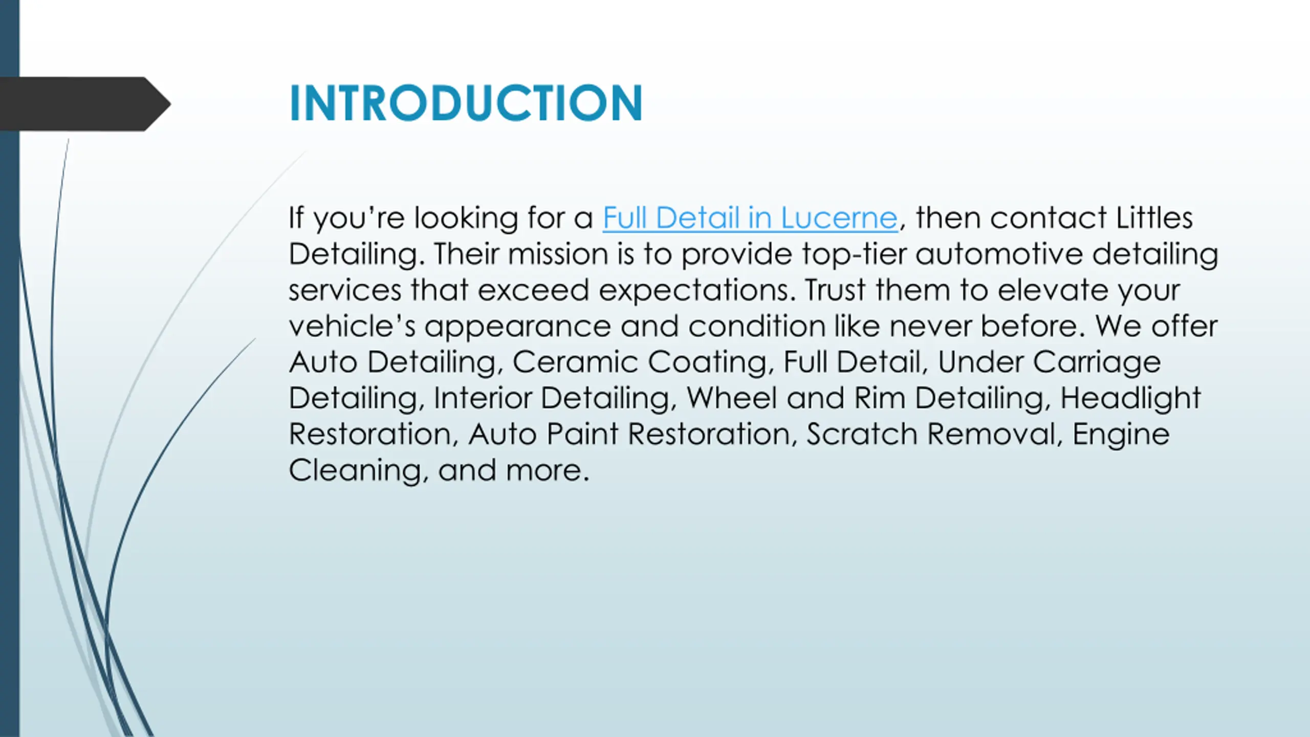 INTRODUCTION If you re looking for a Full Detail in Lucerne, then contact Littles Detailing. Their mission is to provide top-tier automotive detailing services that exceed expectations. Trust them to elevate your vehicle s appearance and condition like never before. We offer Auto Detailing, Ceramic Coating, Full Detail, Under Carriage Detailing, Interior Detailing, Wheel and Rim Detailing, Headlight Restoration, Auto Paint Restoration, Scratch Removal, Engine Cleaning, and more.