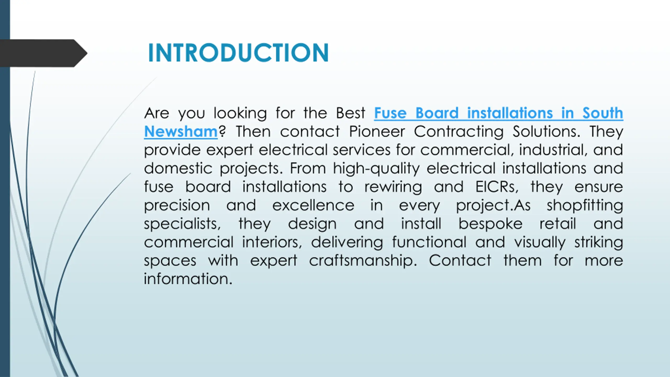 INTRODUCTION Are you looking for the Best Fuse Board installations in South Newsham? Then contact Pioneer Contracting Solutions. They provide expert electrical services for commercial, industrial, and domestic projects. From high-quality electrical installations and fuse board installations to rewiring and EICRs, they ensure precision and excellence in every project.As shopfitting specialists, they design and install bespoke retail and commercial interiors, delivering functional and visually striking spaces with expert craftsmanship. Contact them for more information.