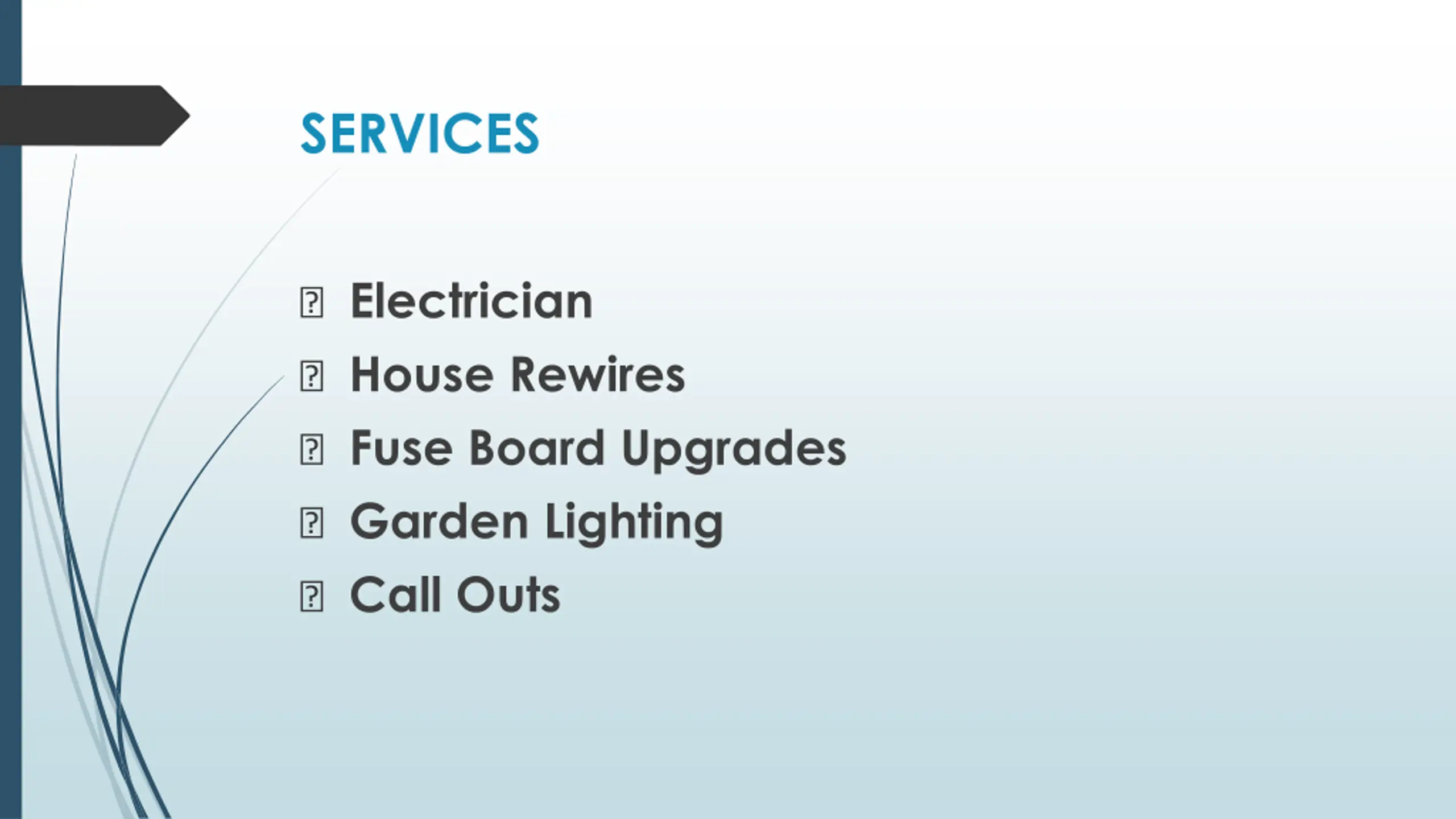 SERVICES ? Electrician ? House Rewires ? Fuse Board Upgrades ? Garden Lighting ? Call Outs